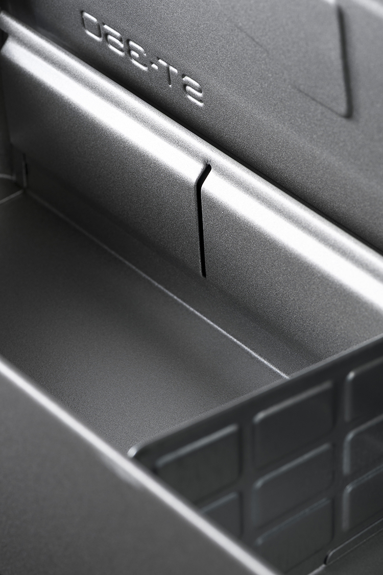 開閉部分は、ひと目で中身が見渡せて、工具の出し入れもスムーズな両開き仕様。開いた時の姿もメカニカルでカッコいい。