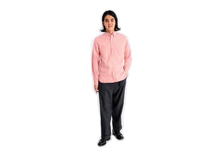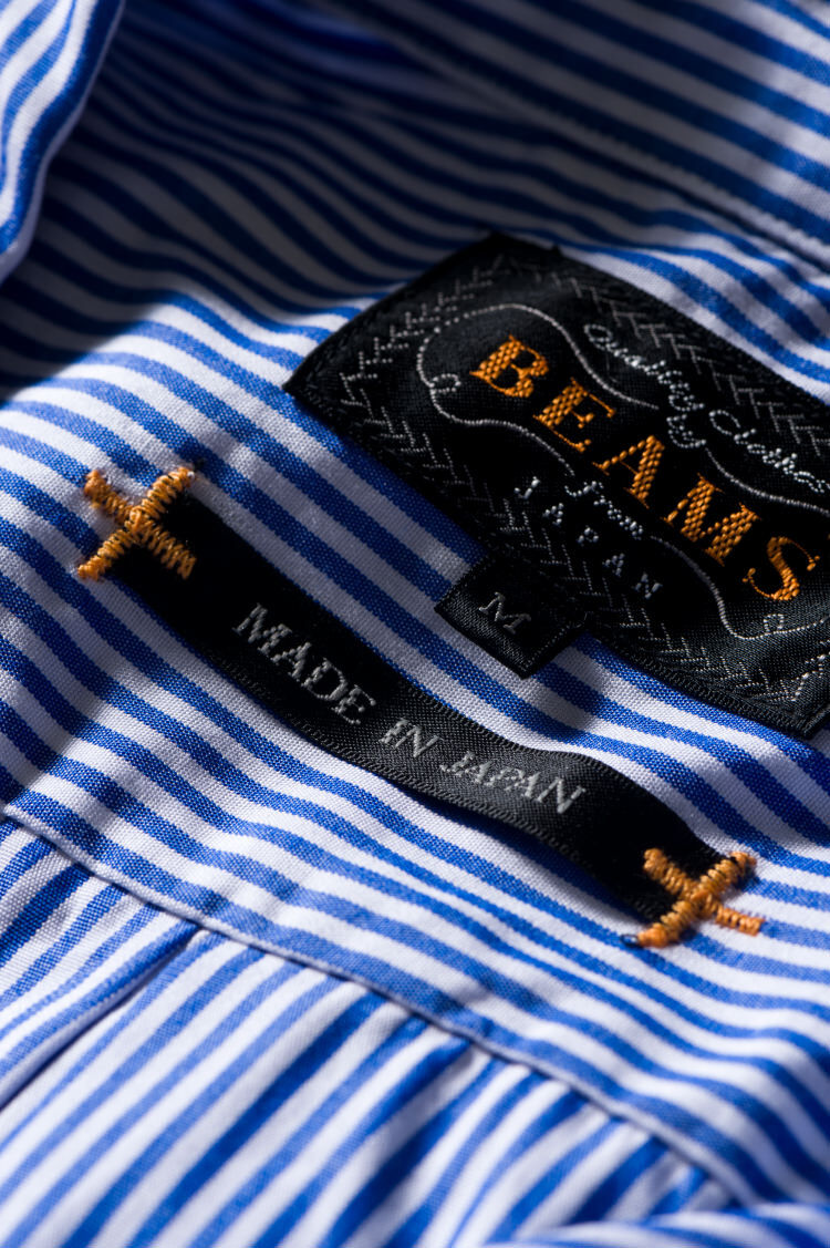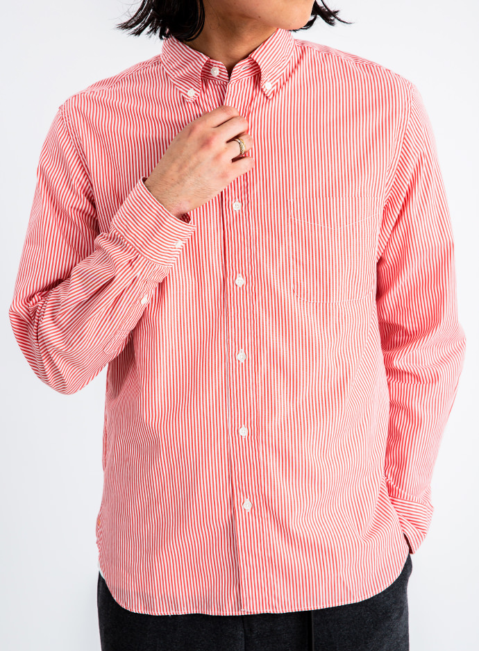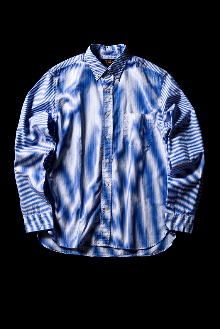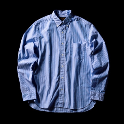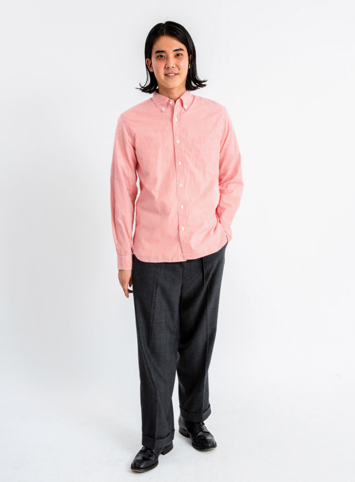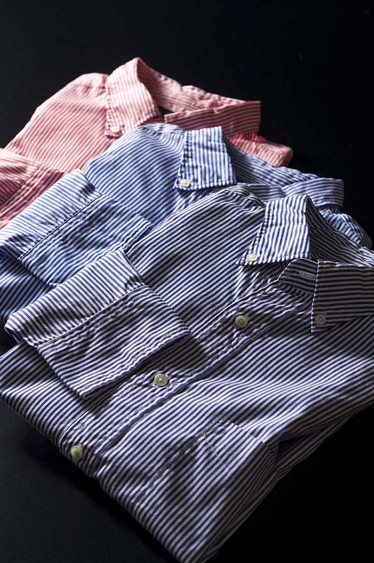 ちなみに簡単に仕様から申し上げますと、生地はドレスシャツにおいても高級感のある、細番手の100番双糸のブロードを使用。縫製も日本国内の熟練のシャツ工場で行われ、まさにスペックは一級品のドレスシャツです。でもこのカジュアルにこなれた雰囲気、なんで!?って思いません? そのワケは、あらかじめ製品洗いがかけられているから。でもって1960年代の米国のシャツをベースにした、スポーティなボタンダウン顔&胸ポケ付き。そして極めつけが、ストライプのピッチ(幅)が細かいこと。だからドレスな主張が控えめで、ビジカジにも使いやすいんですね~。