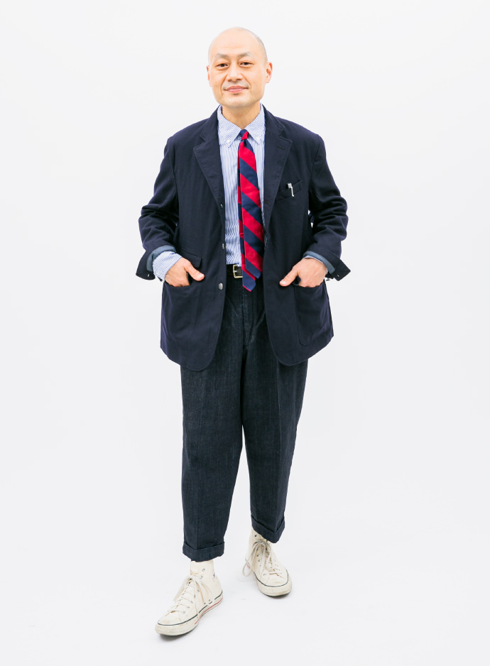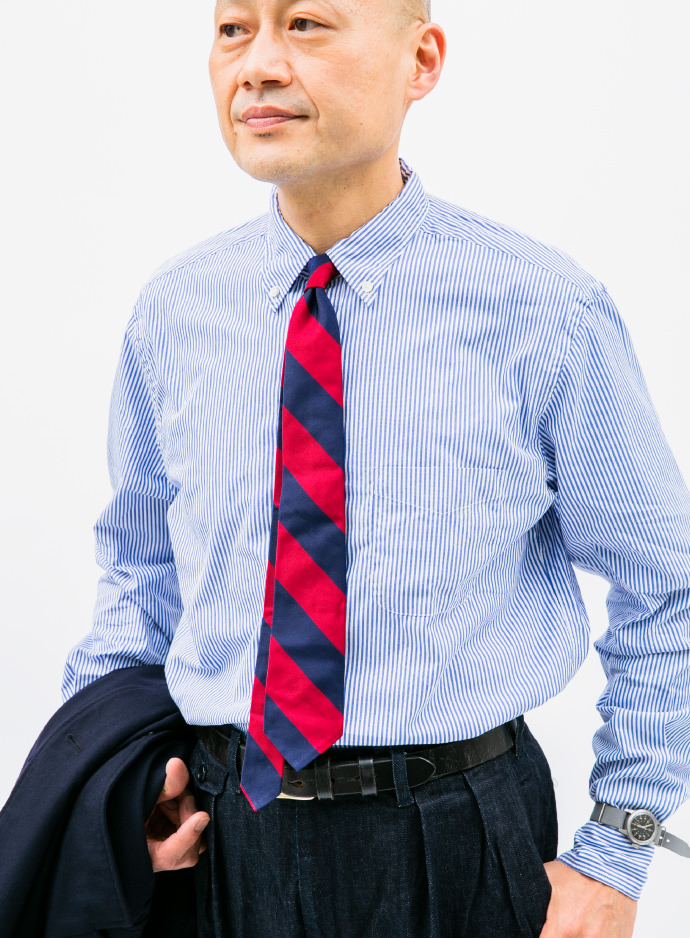 ストライプシャツにストライプタイをオン。パターンオンパターンの遊びを利かせたスタイルにしてみました。一年中使い勝手の良い生地で、洗いざらしでもサマになるのが嬉しいですね。