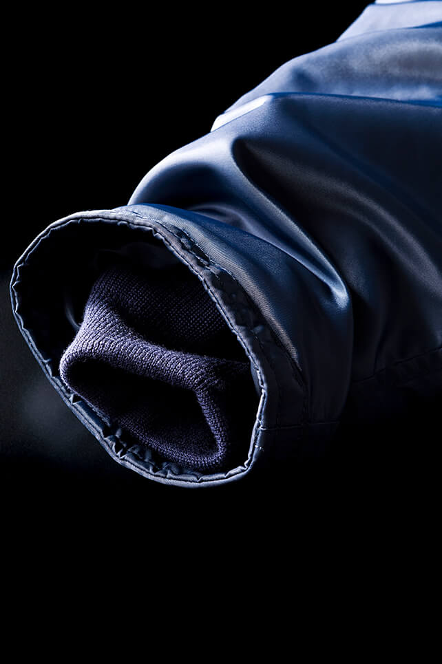 袖口からの風雪の侵入を防ぐ隠しリブもネイビーで都会的な印象に。