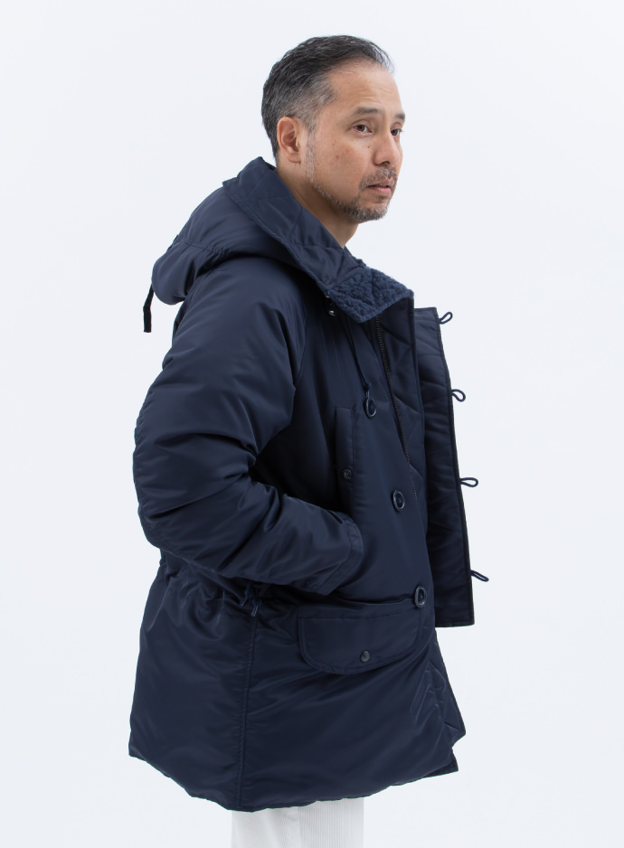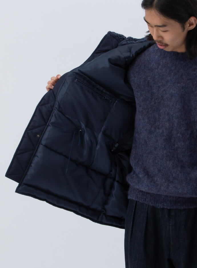 中綿には〈アライド フェザー ダウン〉社の650フィルパワーダウンをふんだんに使用。ハンドウォーマーポケットや首元、フードの内側にはボアを配して防寒性を高めています。だけど目に見える箇所をまるっとネイビーに統一しているからこそ、無骨にならないんだよなぁ。ホント上手い!
