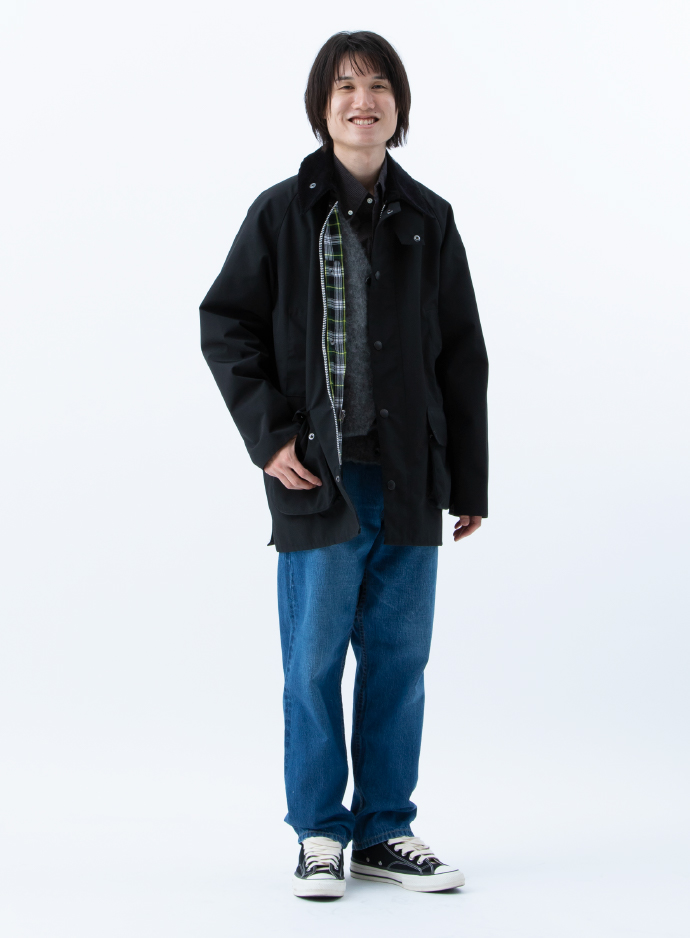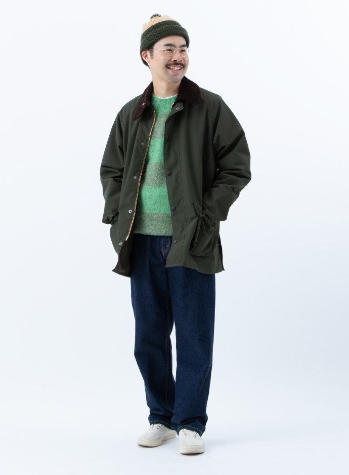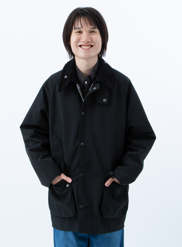 この〈ビームス プラス〉の別注版では、シェルの撥水を昔ながらのオイルに頼らず、超現代的な2レイヤーのラミネート生地で叶えているのが最大のポイント。見た目は昔ながらのマットな表情ですが、触ってもサラッサラ!それでいて水濡れ、風への抵抗力は格段に上がっています。襟を立ててチンストを締めて、袖口の内側はインナーリブで……と寒さ対策も完璧。あとはデートの終盤に、クラシックフィットのゆったり目な腕を軽~く上げて、「バブアーのココ、空いてますよ!」とお相手の腕のやり場を用意するのが現代日本の紳士のエスコート術です。たぶん。