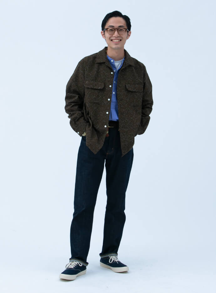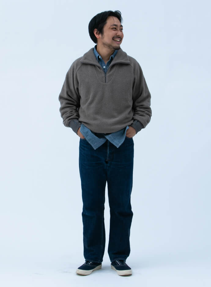 ミリタリーラストを採用した別注仕様に合わせて、デニムやハーフジップニットを合わせた無骨なスタイルにまとめました。トップサイダー特有のラフな雰囲気が、コーディネートを軽快に見せてくれます。