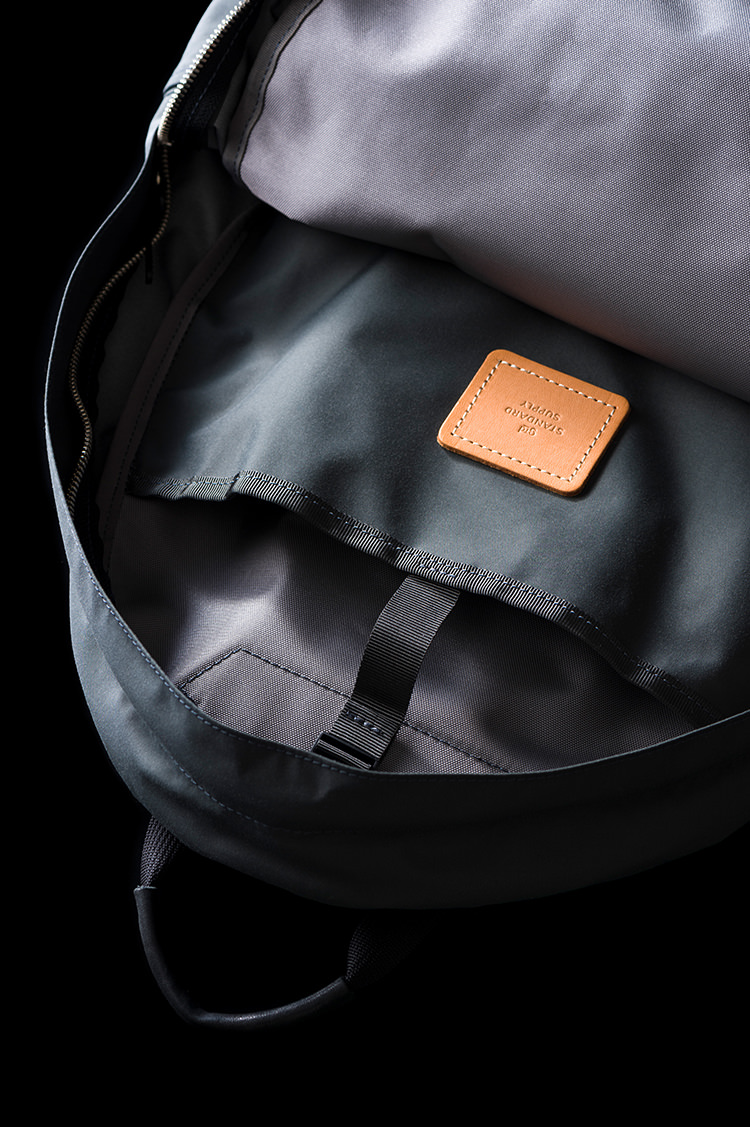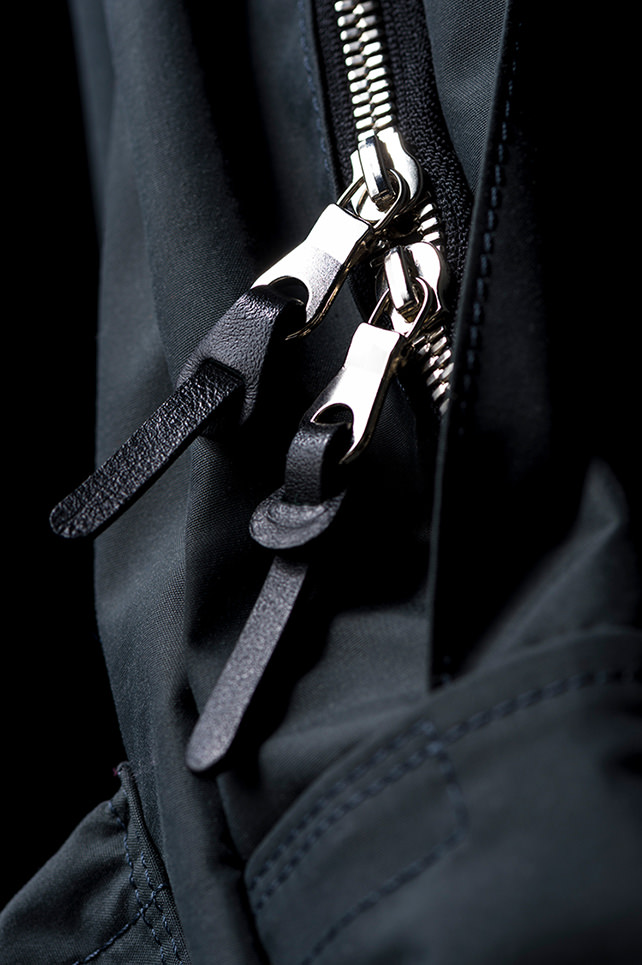 メインに使われているボディの素材。見た目はビジネスにもカジュアルにも振れる上品なナイロンオックスフォードなんだけど、じつは防水透湿機能を備えた『ブリザテック』生地なんです。アウトドアウェアなんかに使われるれっきとしたハイスペック生地。だから予報が外れて急に雨が降り出しても、中身を守ってくれてPCやタブレットの持ち運びも安心ってわけ。クラシカルでミニマル、それでいて多彩な収納を備えたハイスペックデイパは、週7で八面六臂の活躍をお約束します♪
