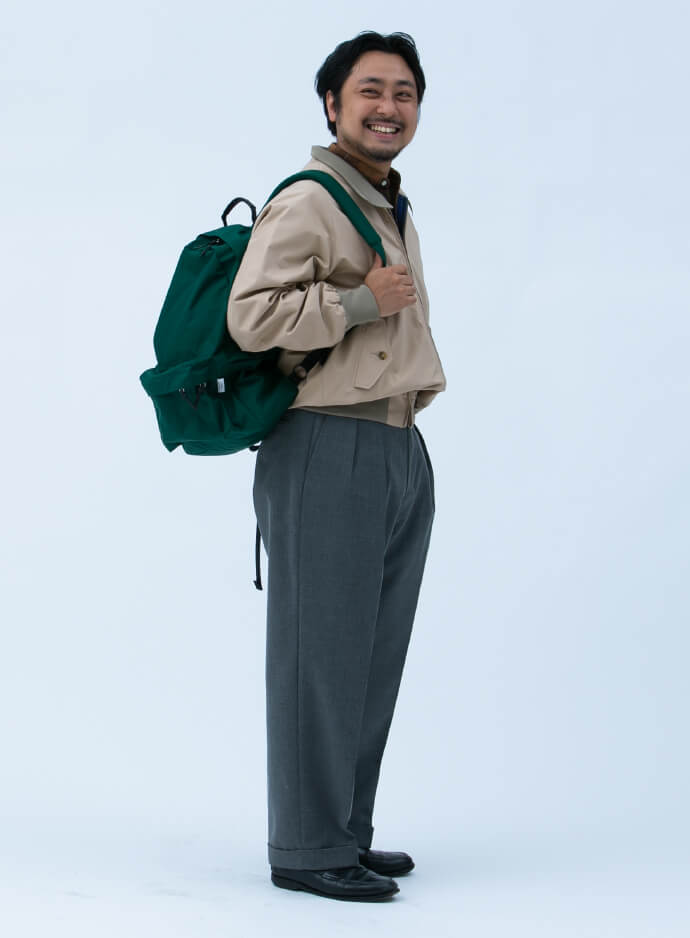 スポーティな印象のグリーンに合わせてドリズラーを羽織り、新鮮なビジカジスタイルに。アウトドアライクな色でもあるので、休日は“マウンパを着てヨセミテ国立公園へ”、みたいなスタイリングもオススメ。