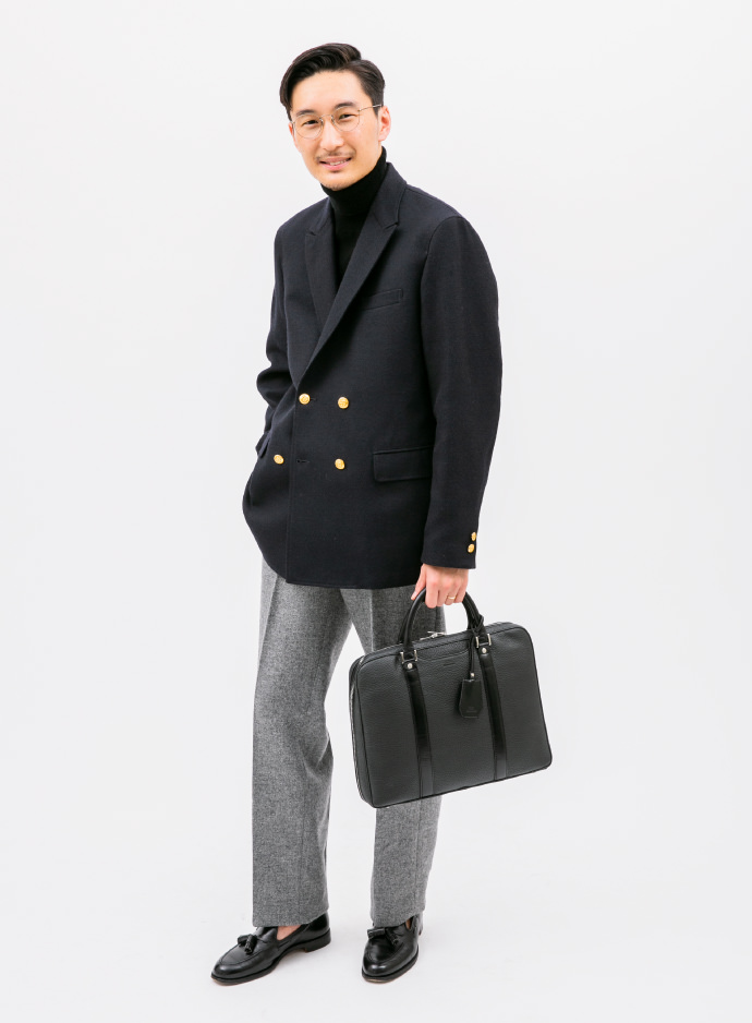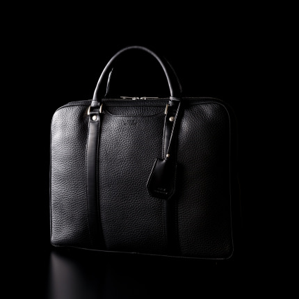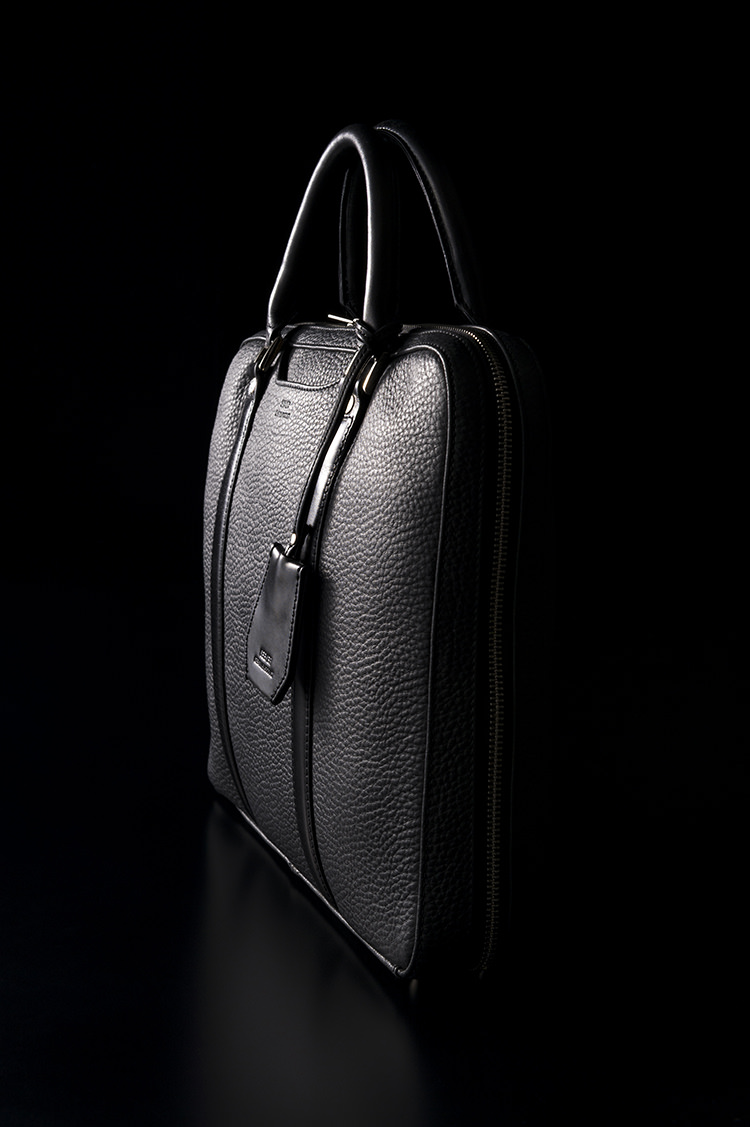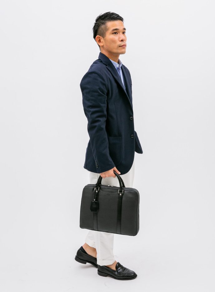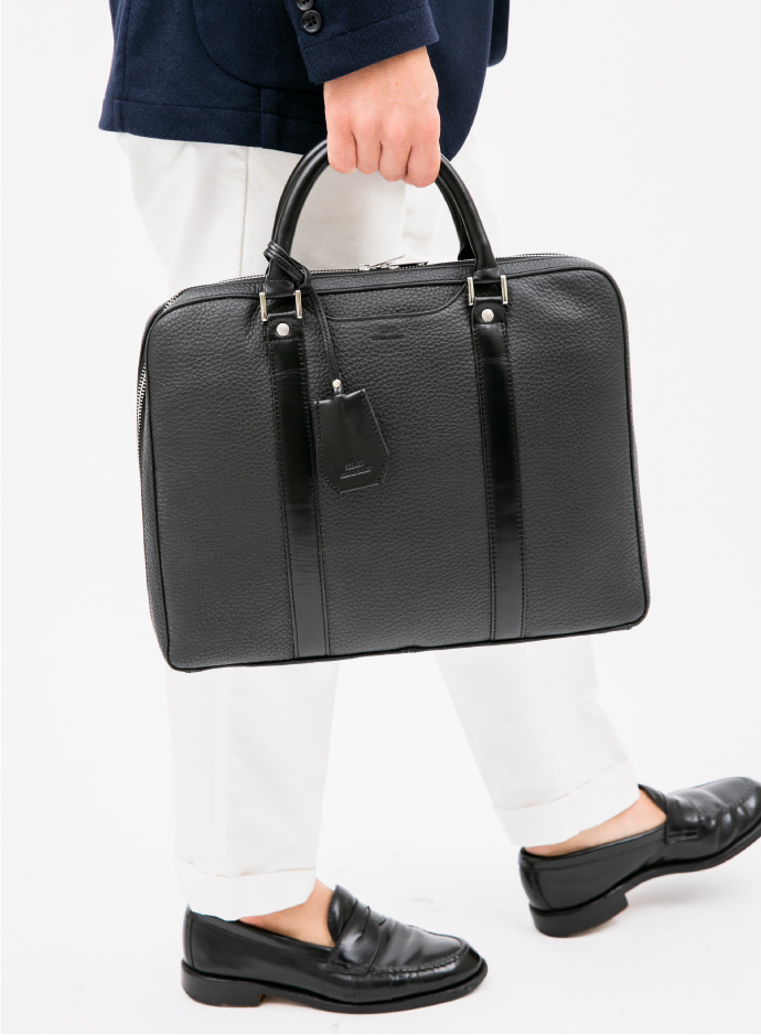 〈シーカー〉はレザーのポテンシャルに強く、ハイコスパな日本のカバンメーカー。日本人が普段使いするにはやはりジャパンブランドに一日の長があります。繊細でキメ細やかなボディのシボ革はキップレザーに型押ししたもので、上品に見えるのに曲げ伸ばしに強く、また多少の小キズは目立たない、ビジネスのレザーバッグとしては理想的な素材。車もカバンも最終的にはハンドルを握って決めると思いますが、ハンドル周りはスムースなままのキップレザーというアクセントがまた、上手いんだよなぁ。