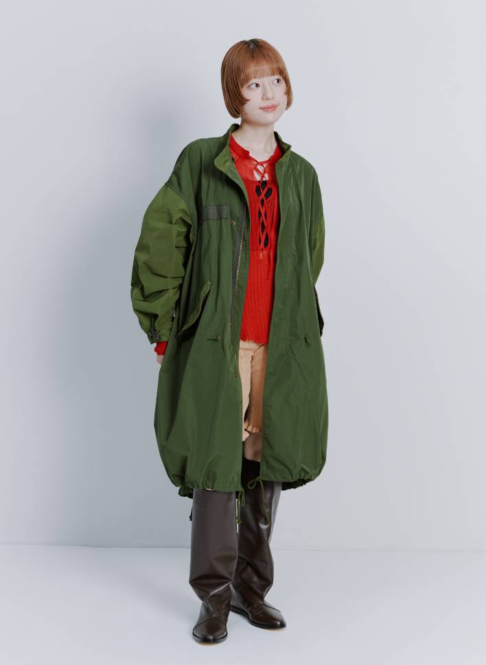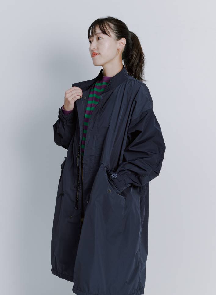 ジェンダーレスで着れそうな大きめシルエットのM65は、ヴィンテージを忠実に再現しつつ撥水性のあるソロテックス®素材で仕上げています。ドロップショルダーで身幅が広く、中に厚手のスウェットやニット、インナーダウンだって重ねられるので夏以外の3シーズンで楽しめるのも魅力のひとつ。軽い着心地で、シワがついても手でなでつけることで軽減できます。
