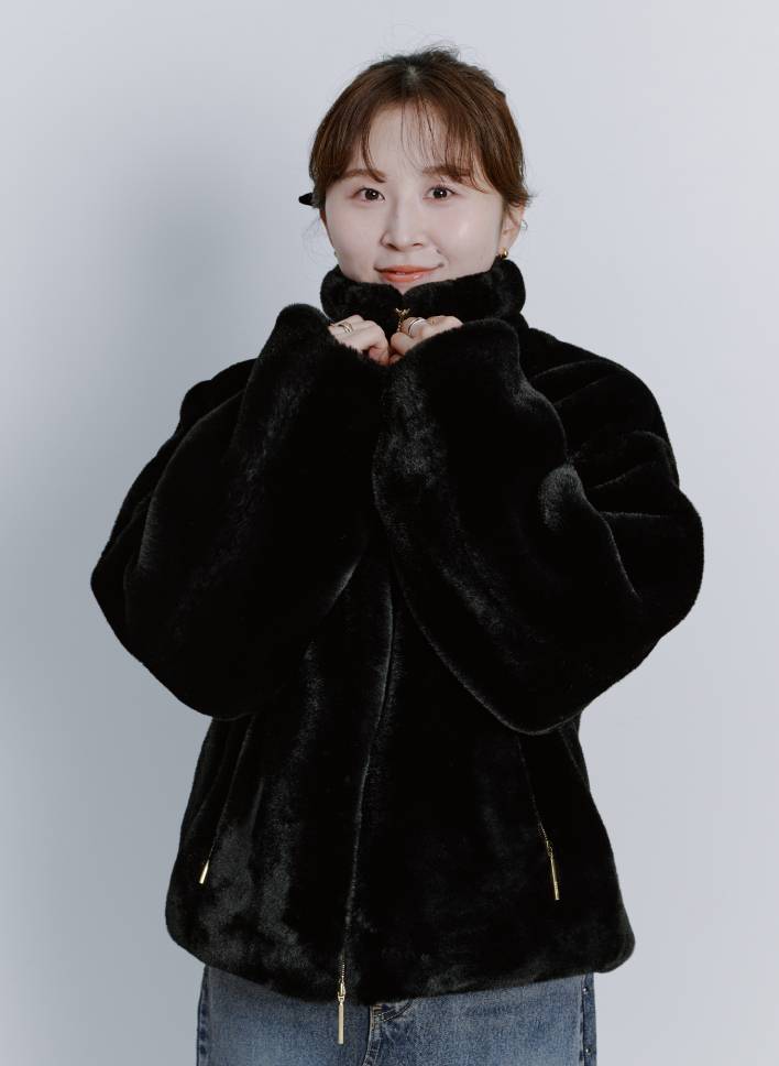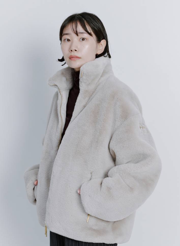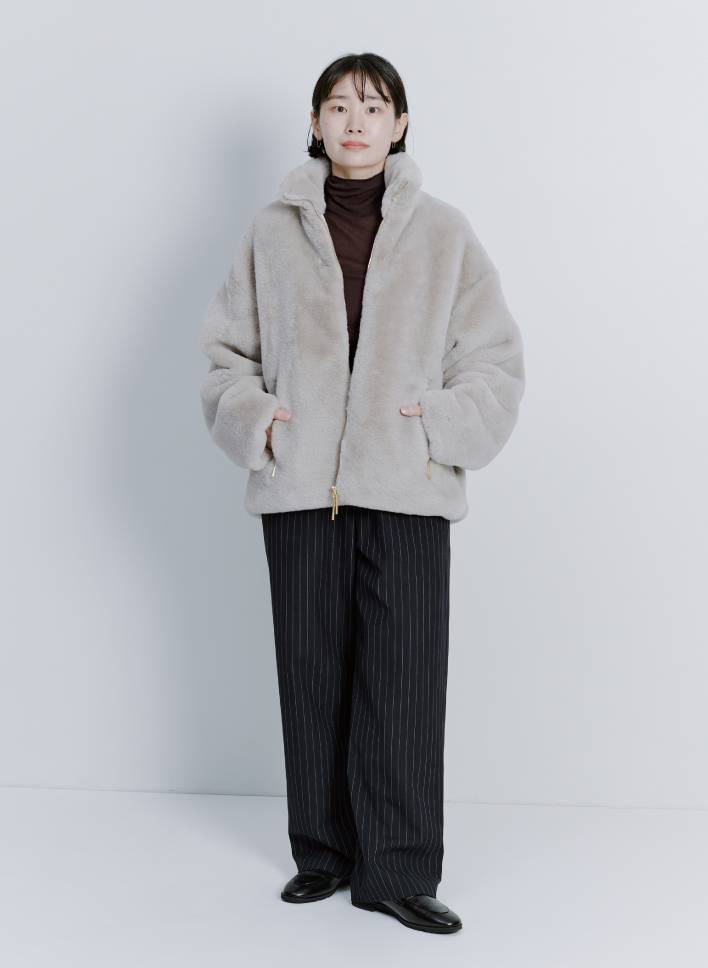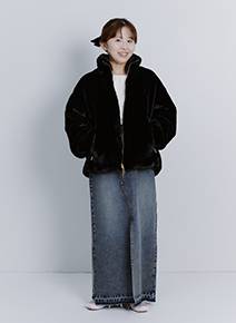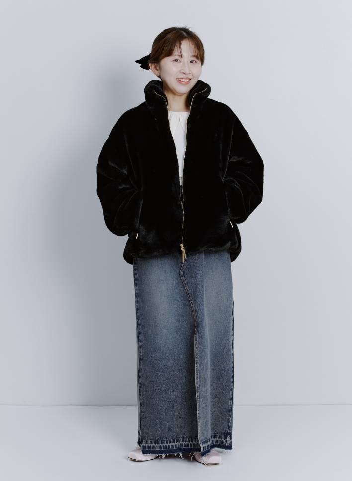 「上品なツヤ感のあるエコファーは、カットソーとデニムスカートでカジュアルな着こなしにまとめました。首元までジップを閉めれば、マフラー要らずであったか。顔が少し隠れるくらいのボリューム感もたまりません。ワンピースに羽織るシンプルなフェミニンコーデもしてみたいです」