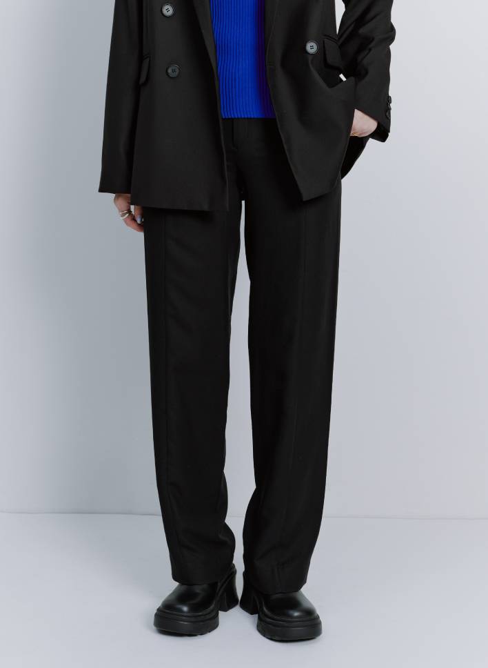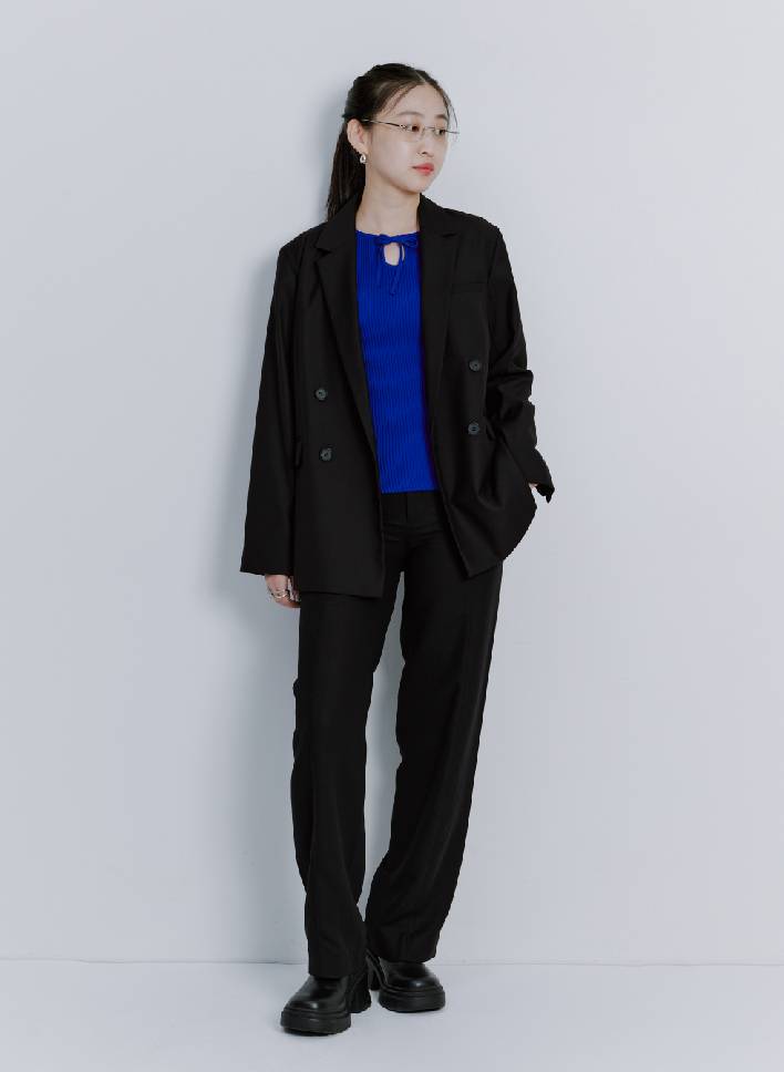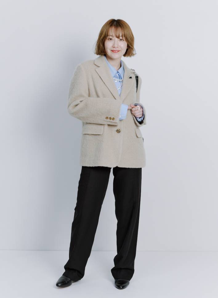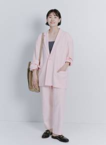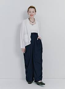 「このパンツ、とにかくシルエットがきれいなんです。脚を長く見せてくれる絶妙な丈感がGOOD。ジャケットを合わせてシンプルにスマートな雰囲気にまとめました。インナーに鮮やかなブルーをアクセントに持ってきたのがポイントです。ゆるめのニット合わせもおすすめ」
