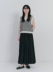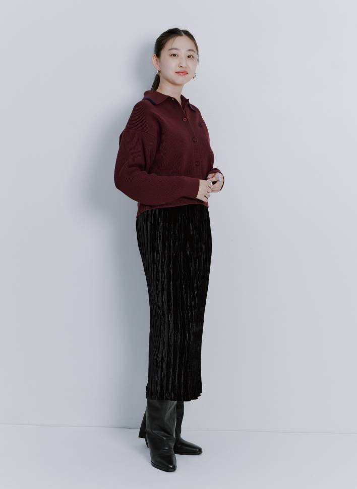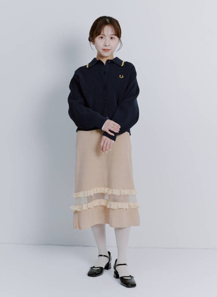 「カーディガンから色を拾った統一感のあるスタイルにしてみました。ショートな着丈とボリュームのある袖がメリハリを生み、体型問わず好バランスな着こなしを叶えてくれます。上下どちらもニット素材なので足元はツヤ感のある靴とシアーソックスで抜け感をプラスしました」
