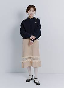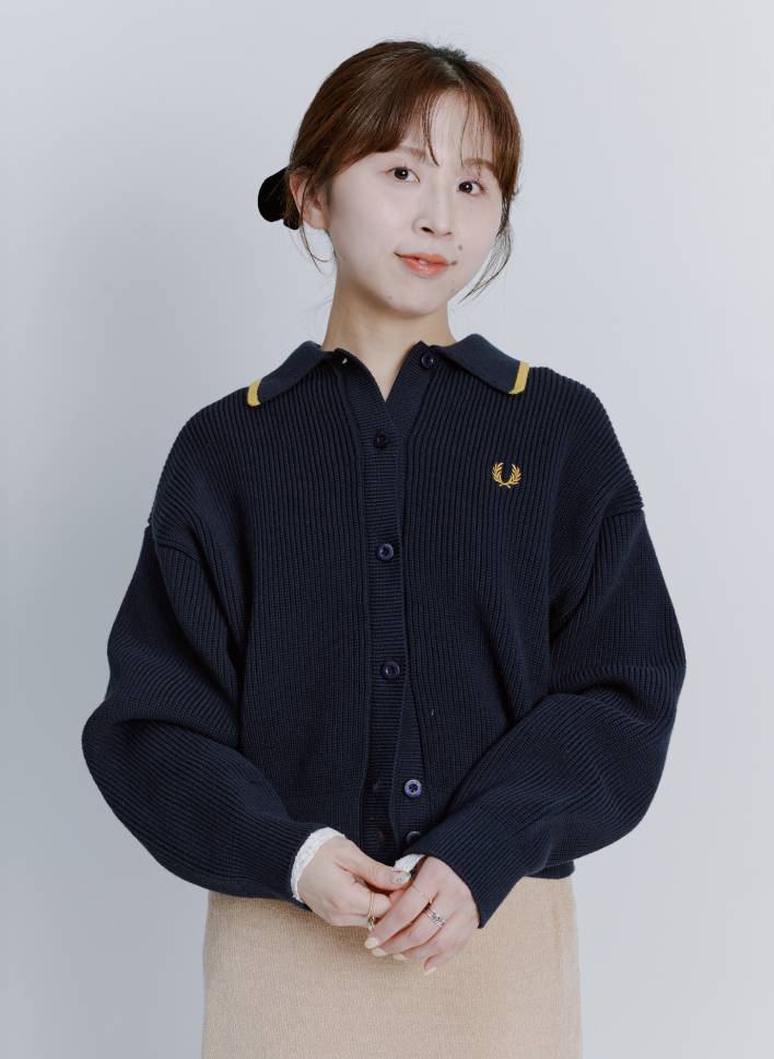 「大人が〈フレッドペリー〉を着るなら……をテーマにコーディネートしてみました。個人的にスカートの足元はロングブーツがおすすめ。前開きで着用できるのでプリントTの上から羽織り、ボトムスはワイドシルエットのデニムと合わせた着こなしもしてみたいです」