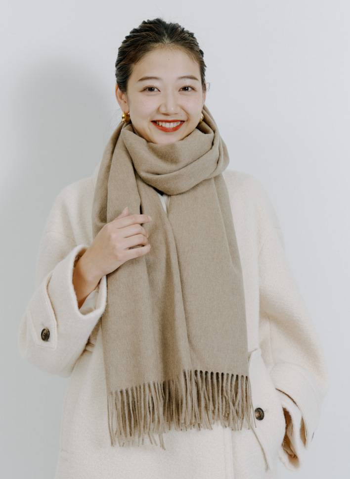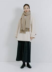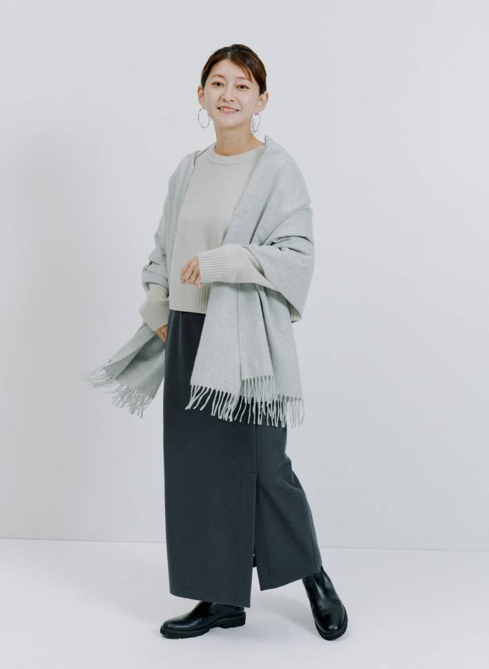 「大判サイズのたっぷりとしたストールは、思い切って顔まわりにざっくり巻きつけるのがかわいいです。上質なカシミア素材で敏感な肌をやさしく包みます。ヘアをアップにし、メリハリのある印象に仕上げました。M-65コートやスウェットパンツに合わせるなど、あえてカジュアルな着こなしに合わせたいです」