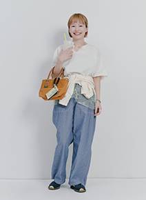 「ブランドのアーカイブモデルを踏襲したデザインは名品と呼ばれるにふさわしいクラシカルな印象が魅力です。バッグのこっくりとしたブラウンが引き立つよう、ウェアはホワイトやブルーの淡い色合いをチョイスして軽さをプラスしました。ミニサイズながら、小さめのマイボトルやポーチなども入ります」