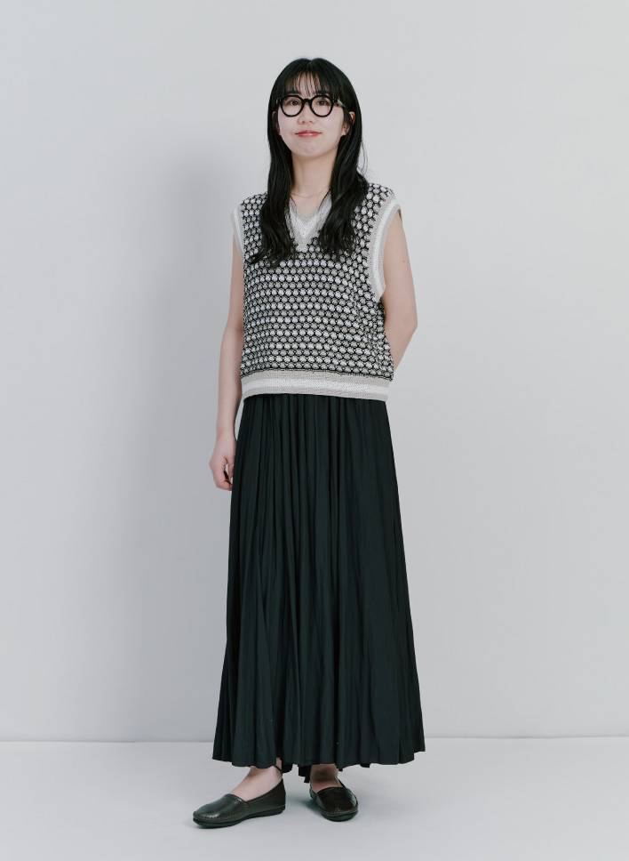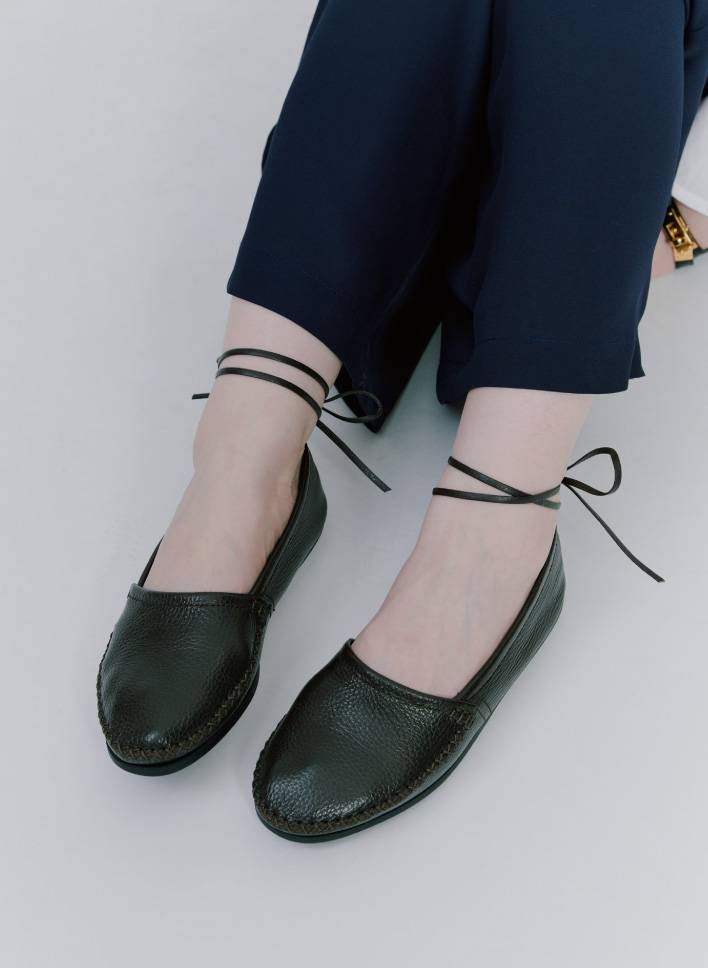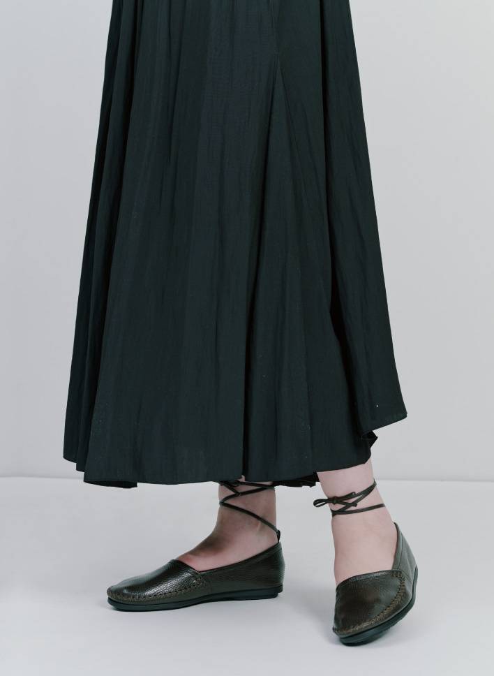 「足にスッと馴染む履き心地がイチ押しのフラットシューズは、軽量でホールド感があり歩きやすさも抜群。機能的でありながら、コーディネートのアクセントになるデザイン性がGOODです。歩くたびに裾に動きが出るスカートと合わせて、足首に巻いたアンクルストラップをチラ見せするのがおすすめ」