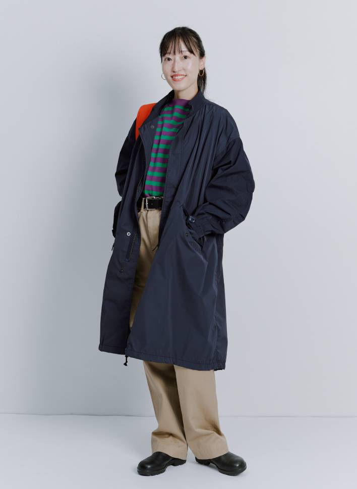 「ボリューミーな見た目に反して、軽くて着やすいのが魅力です。ジップを閉めれば首元もあたたかく、万年ショートカットの私にとっても嬉しいブルゾン。着こなしのコツは、締め色を選んですっきりとさせること。ボトムスのストライプで縦ラインを活かすのもポイントです」