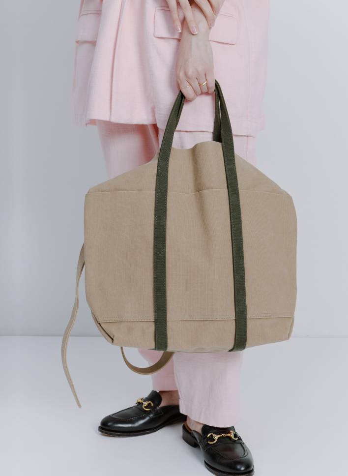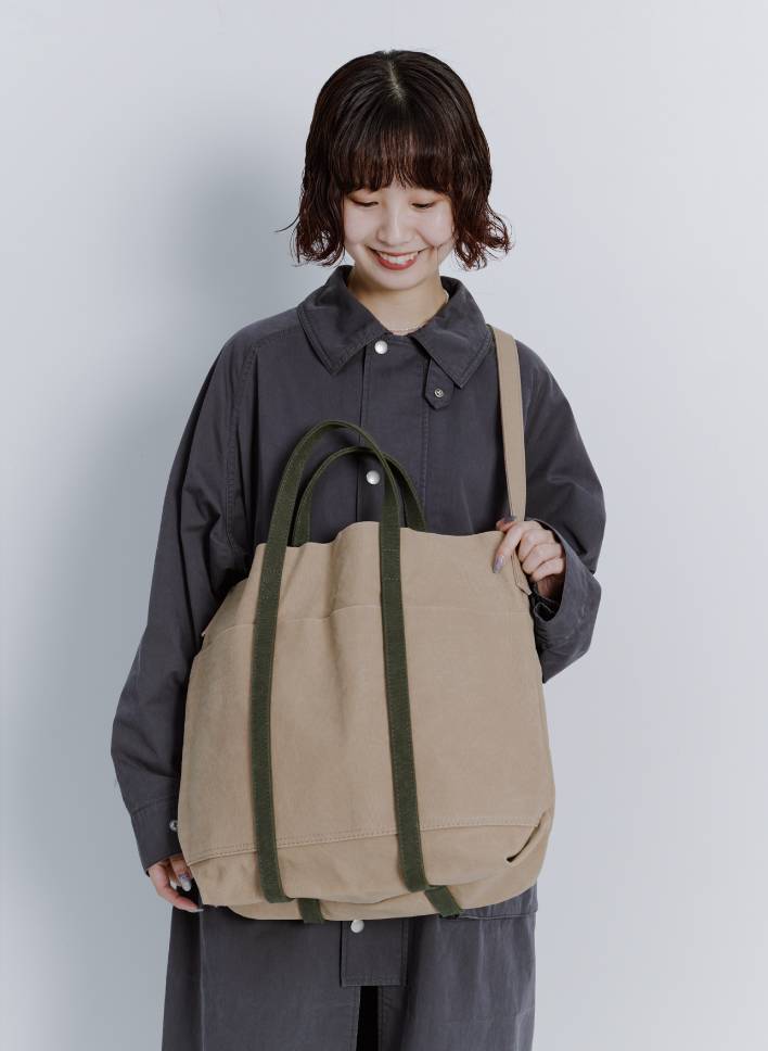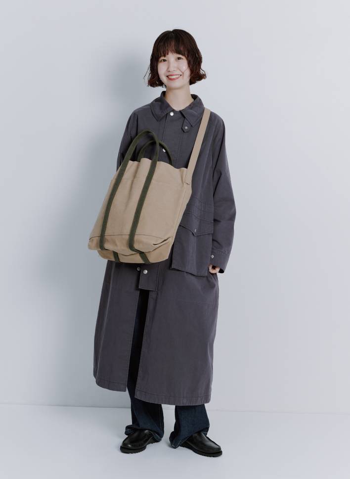 ベージュとオリーブという地味色の組み合わせながら、ただものではない存在感。こちらは工程がかかる高級な「コーマ糸」を使用し、岡山県の工場でいまではレアとなったシャトル織機で織っているという日本の技術が集結したキャンバストートなんです。なによりうれしいのがこの外ポケット! ポイっとなんでも入れられるのでわずらわしさがなく、忙しい方にもってこい。