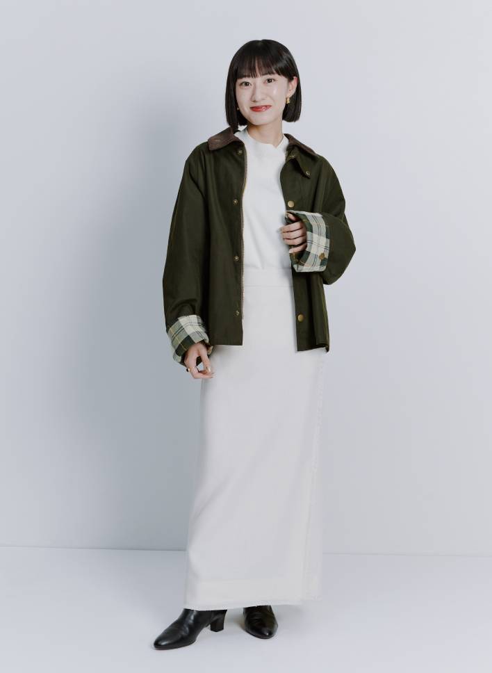 「〈バブアー〉を主役にしたくて、ジャケット以外はオールホワイトに。少しきれいめなスタイルで合わせてみました。スウェットのセットアップやデニムと合わせたカジュアルな着こなしもしてみたいです。主役にも脇役にもなれる優秀アウター。持っていて損なしですよ」