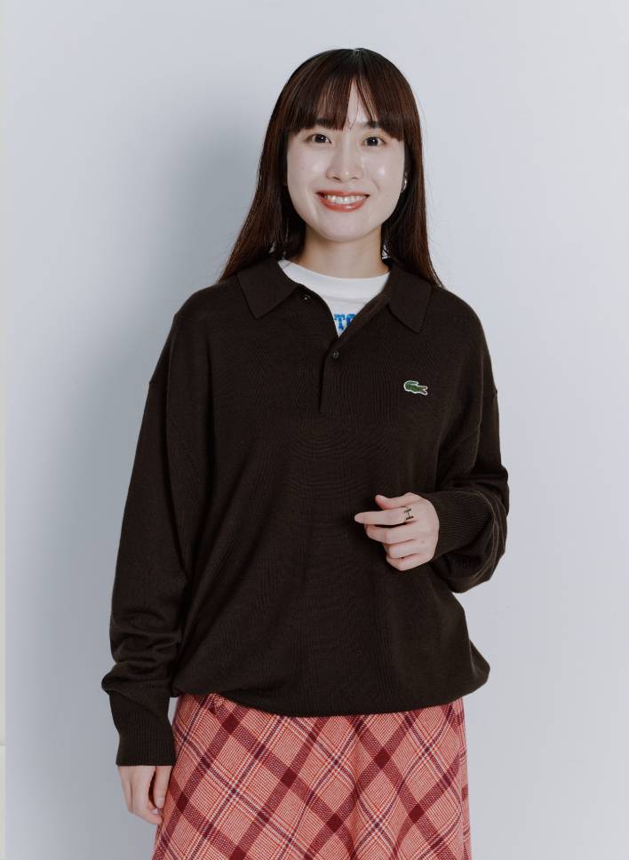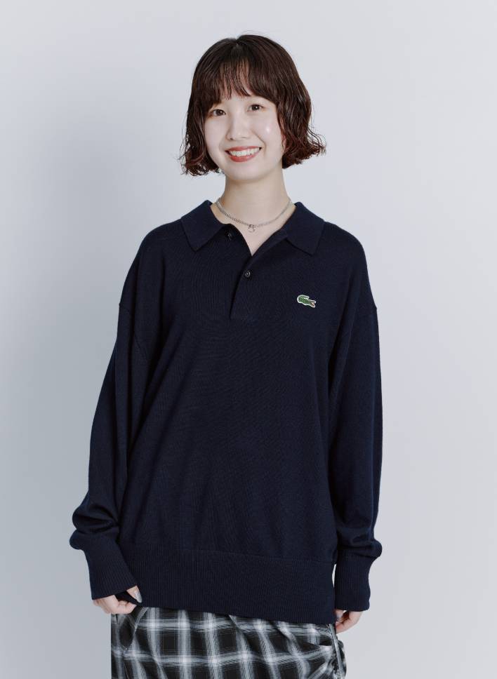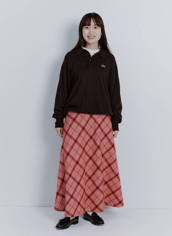 「〈ラコステ〉の別注ポロニットは着心地がとってもよく、今季おすすめのアイテム。ゆったりとしたシルエットなのでタイトめなオンブレチェック柄のスカートと合わせてメリハリのあるコーディネートにしてみました。上質なウールを使用し、カジュアルになりすぎないのもGOODです」