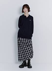 「ダークブラウンのポロニットは、大胆なチェック柄のAラインスカートで目を惹くコーディネートに。襟のボタンを開けてインナーのロンTをチラ見せすることでカジュアルな印象にしてみました。スラックス合わせの定番スタイルも気になります」