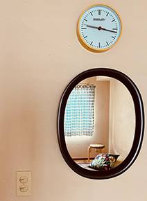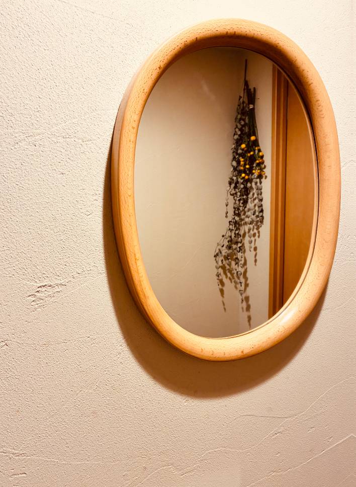「〈柳宗理〉がデザインした小判型の鏡。『秋田木工』の確かな曲げ木の技術で生み出された美しい曲線が魅力です。寝室やバスルームに壁掛けしていますが、いろいろな家具とも調和し、飽きのこないシンプルで洗練されたデザインがお気に入り。大切に使っていきたいですね」