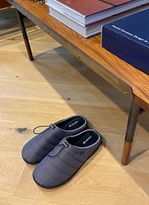 晩秋になると室内履きを〈スブ〉に変えるという冷え性の方も多いのではないでしょうか。今季の別注はアッパーにドローコードをモチーフに配し、スポーティな印象に。メタリックなパーツと光沢のあるナイロン素材が相まり、サンダルながら洗練されたムードに仕上げています。中綿の暖かさはもちろん、ライニングが起毛素材なので足を入れたときにほっとした感覚を味わえます。