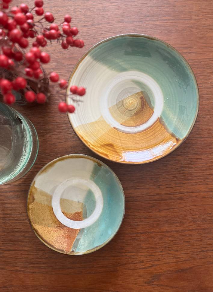 大分県日田市で300年の歴史を持つ“小鹿田(おんた)焼”の窯元〈坂本浩二窯〉にオーダーし、最初期の染め分けのデザインを再現したここにしかないスペシャルな取り分け皿。料理を引き立てつつ彩りを与える配色で、食事時間を充実したものに。民芸運動を提唱した柳宗悦がその価値を広め、国の無形文化財の指定を受けた民釜の素晴らしさをぜひ食卓で堪能してください。