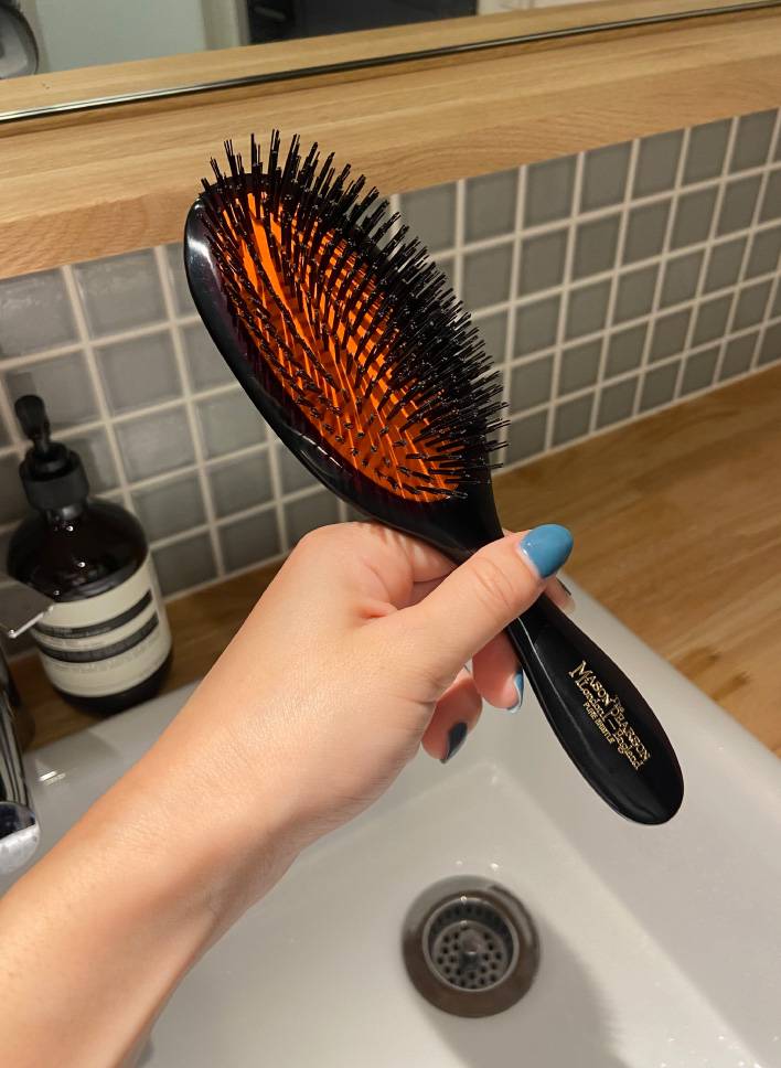 一生もののヘアブラシとして持っておきたい〈メイソンピアソン〉のシリーズのなかで、日本での人気がいちばん高い“ハンディブリッスル”。英国で150年の歴史を持つ、ハンドメイドヘアブラシ界の最高峰ブランドです。獣毛のブラシは静電気が起きにくく、自然とサラサラな髪が叶います。専用のクリーニングブラシつきなので、ケアしながら長く愛用して。