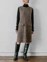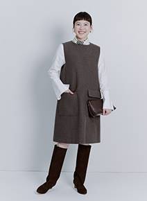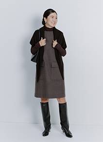 すっかりご無沙汰のミニ丈にこの秋挑戦するなら、大人ブランドから選ぶのが安心。こちらのワンピースはストンと落ちるボックスシルエットとしっかりとハリのある素材が、大人女性の体型悩みをさりげなくカバー。広がりすぎないから、ミニワンピながら甘さ控えめに着られます。ブーツ合わせはもちろん、シックな色味のタイツをアクセントにしたコーデもおすすめ!