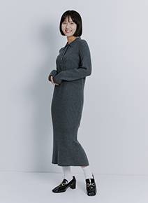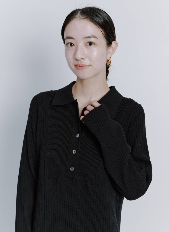 「伸縮性があるニット素材のワンピースは、リブが程よく身体に沿ってくれるので着るだけで女性らしいラインを形づくってくれます。1枚できまるアイテムなのでオールブラックでシックにまとめました。ファーベストと合わせるのも素敵になりそうです」