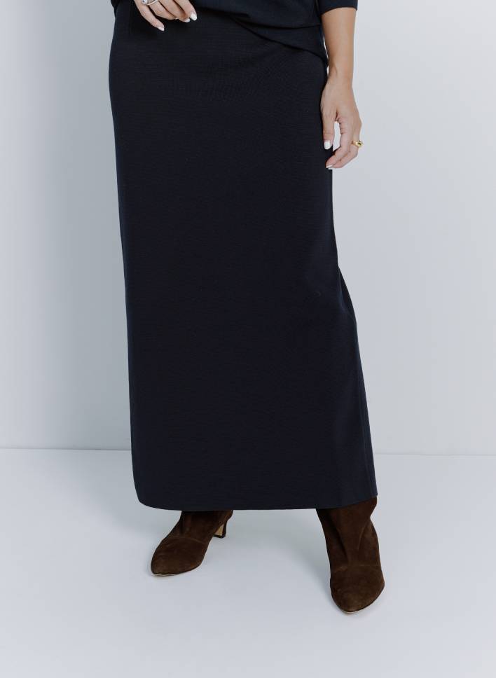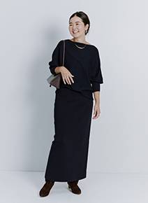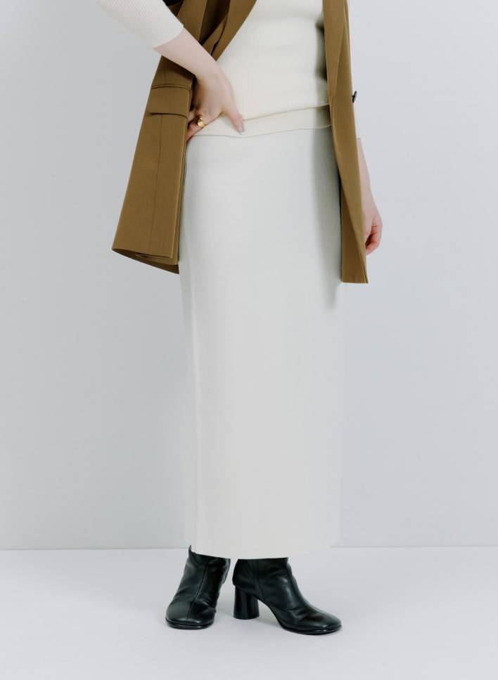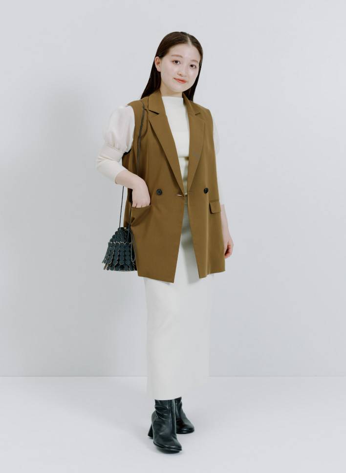 「シルエットが美しいタイトニットスカートはオケージョンからデイリーまで幅広いシーンで使える逸品。ジレを合わせて大人めにコーディネートしました。足元や小物をカジュアルにしても、大人カジュアルな印象に仕上がりますよ。スニーカーを合わせたラフな着こなしも楽しんでみたいです」