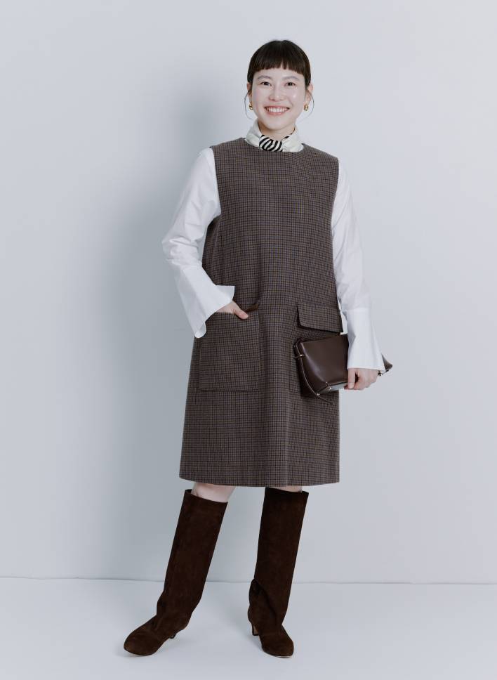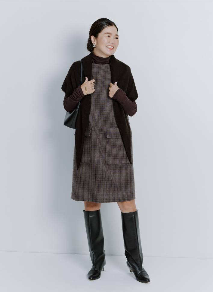 「ディレクター亜希さんおすすめの大人が着られるミニワンピースは、ブラウントーンでまとめてみました。引き締め役としてブラックのロングブーツをチョイス。アクセサリーはシルバーとゴールドをMIXして、チェック柄やブラウンを洗練された印象に仕上げました」