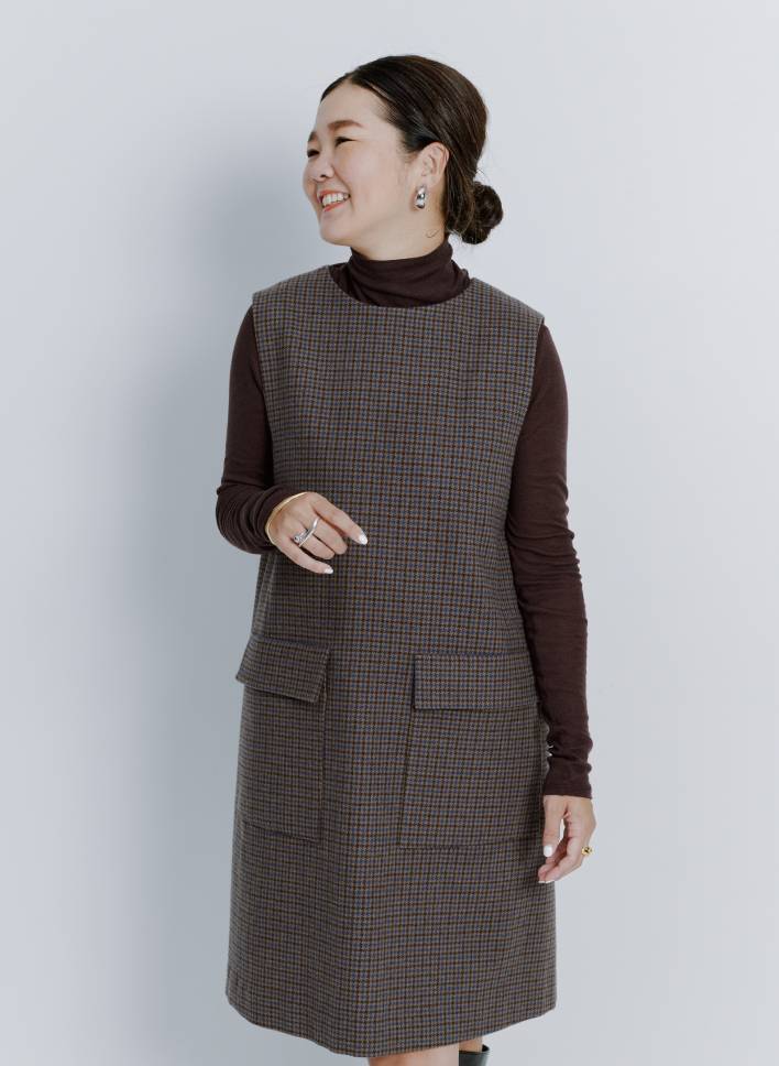 「服をネイビーでまとめ、小物でブラウンを取り入れてトレンドのムードにブラッシュアップしてみました。ボディラインをきれいにみせてくれるのは女性にとって嬉しいポイント。ジレを合わせたスタイルや、ロンT&スニーカーの合わせもおすすめ。通年で使えますよ」