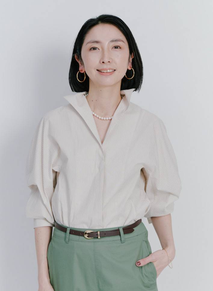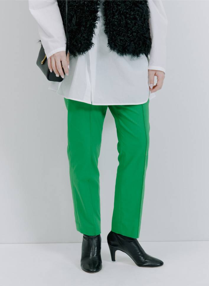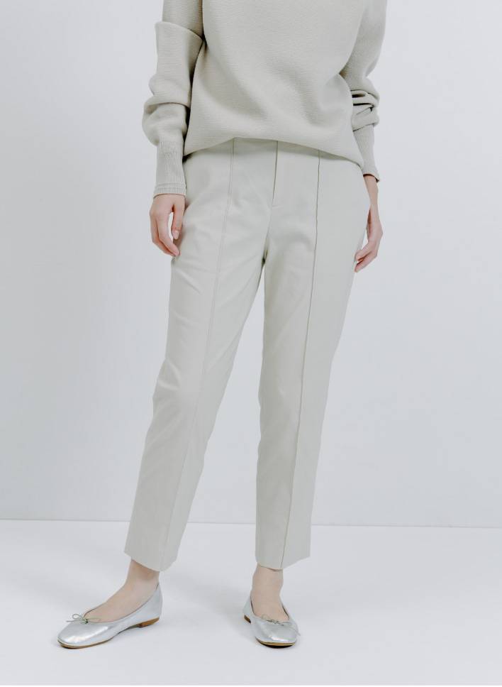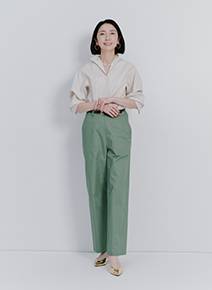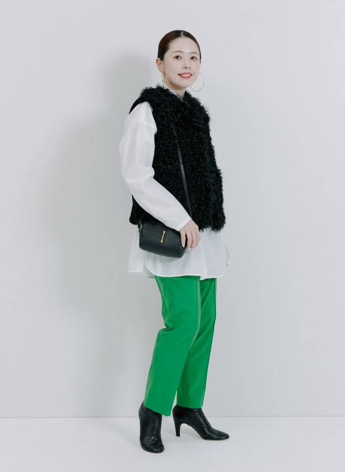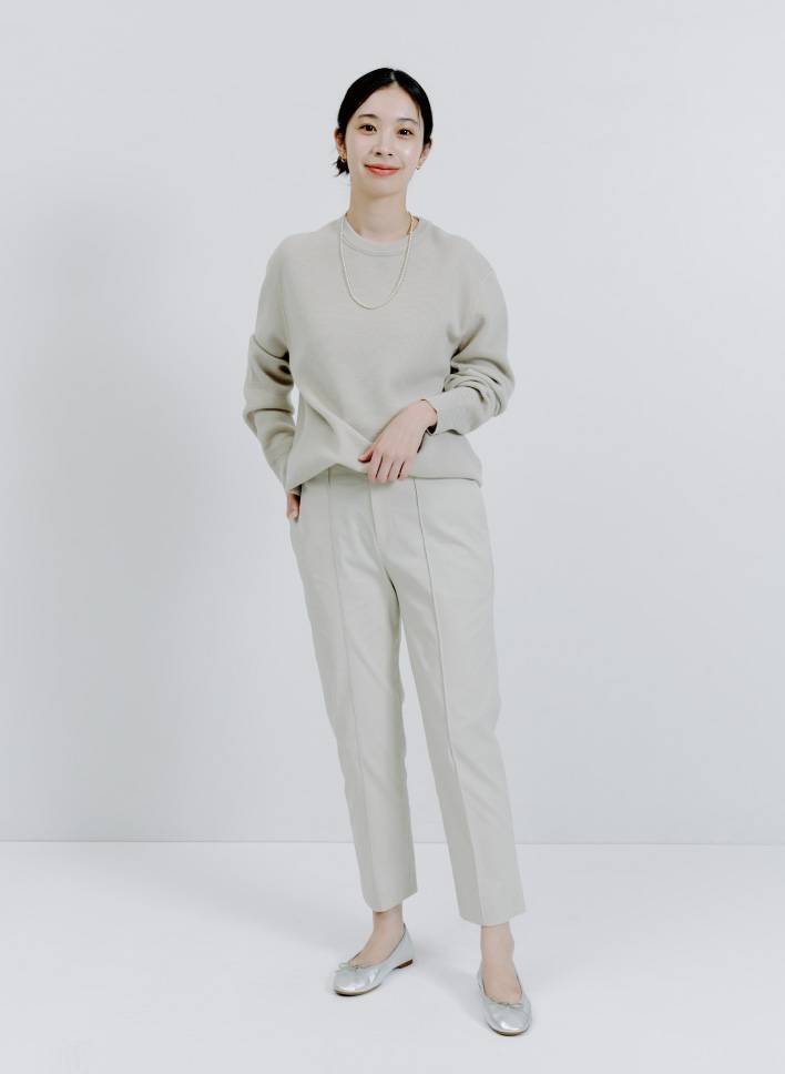 「ストレッチが効いていて快適に過ごせるパンツを主役に。お腹や腰まわりをカバーしつつ、脚を細く長く見せてくれる万能アイテムです。個人的に好きなワントーンスタイルで全身をまとめました。オフィススタイルでも活躍できるパンツなので、ジャケットにも合わせてみたいです」
