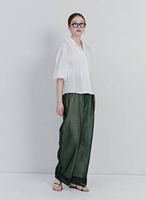 「微光沢のコットン生地のラフすぎない印象を軸に、シアーなオーガンジー素材のパンツとフラットサンダルでまとめてみました。全体的に抜け感を意識して仕上げています。ゆったりとした着心地ですが、ウエストラインの切り替えや胸元の深めの開きで女性らしく着こなせます。手洗い可能なのもポイント高いです」