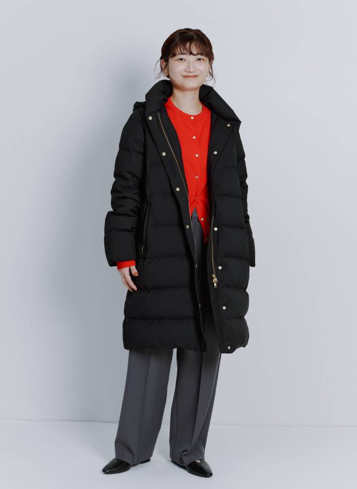 「着膨れが気になるダウンコートも、すっきりとした縦長シルエットがスタイルアップを叶えてくれます。凛としているのにどこか抜け感がある都会的なスタイリングを目指し、ポロニットとワイドデニムを合わせて足元はヒールブーツを。エレガントな大人の冬コーデが完成します」