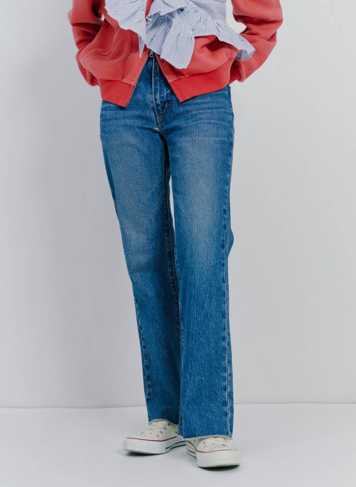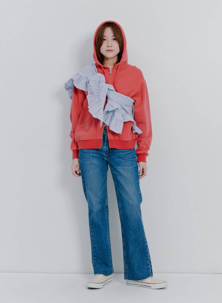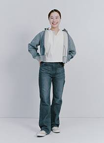 「とにかくシルエットがきれいな国産のデニムです。フーディとスニーカーでラフに着きつつ、フリルのストールを巻いて普通すぎないスタイリングにしてみました。豊富なサイズ展開で、マイサイズ探しを楽しんでもらいたいです。男性でもスリムな方ならいけちゃいます」