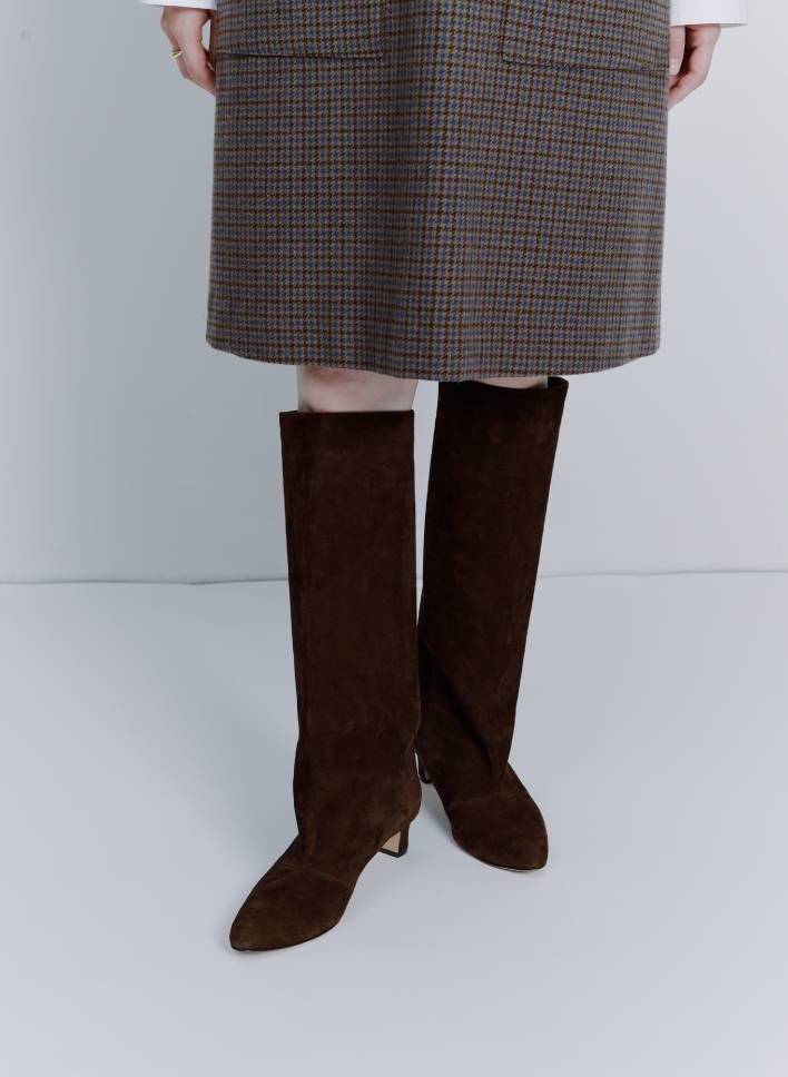 スカートの復権により、ロングブーツに注目している人も多いのでは。せっかくなら長く使えて自分らしさのあるものを選びたいところ。イタリアのスタイルとクラフトマンシップを堪能できるシューズブランドの渾身のブーツがかっこいいんです。あえて足首にくびれをつくらない太筒ストレートシルエットは、脚のラインを拾わずきれいに見せてくれる効果あり。女性らしいトゥ部分とのコントラストが際立ちますね。