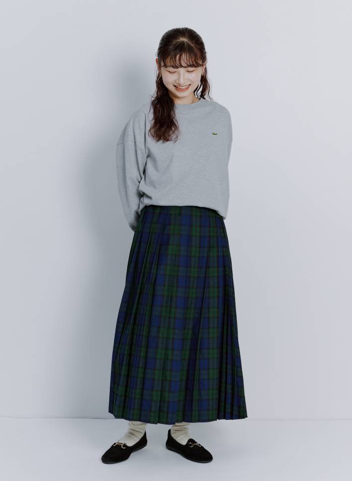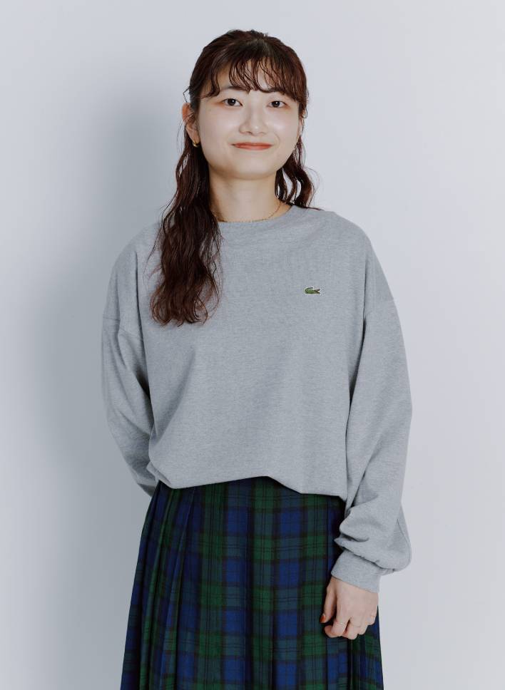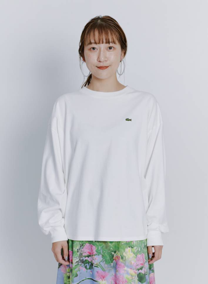 日々のコーデを下支えしてくれる“普通”のアイテムこそ、ディティールにこだわりたいもの。〈ラコステ〉お馴染みのワニさんはデザインのアクセントになるだけじゃなく、上半身の目線を上げてスタイルよく見せてくれる効果も。ほどよくゆったりシルエットで体のラインをカモフラージュしながら、肩周りはすっきりさせたデザインで着膨れせずに着られます。