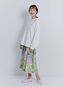 「シンプルなロンTなので、大胆な柄物ワンピースを合わせました。足元はバレエシューズでトレンド感もプラス。ゆったりとした身幅と腰まで隠れる長すぎない着丈で、ボトムスとバランスがとりやすいのも◎。サラッとした素材で着心地がいいのも高ポイントです」