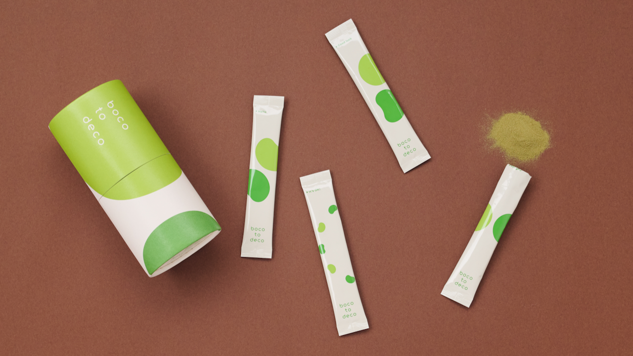 バナナ(1本)と小松菜(1把)、プロテイン適量、豆乳(200cc)、「ボコとデコ」(1包)をジューサーやミキサーに入れてよく撹拌する。甘みが足りない場合はハチミツをプラスしても。
