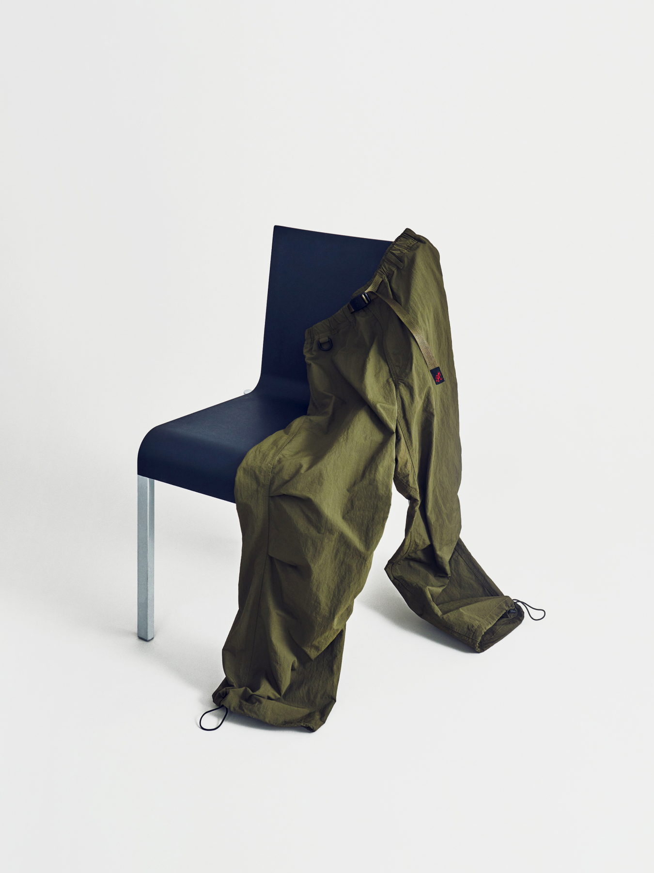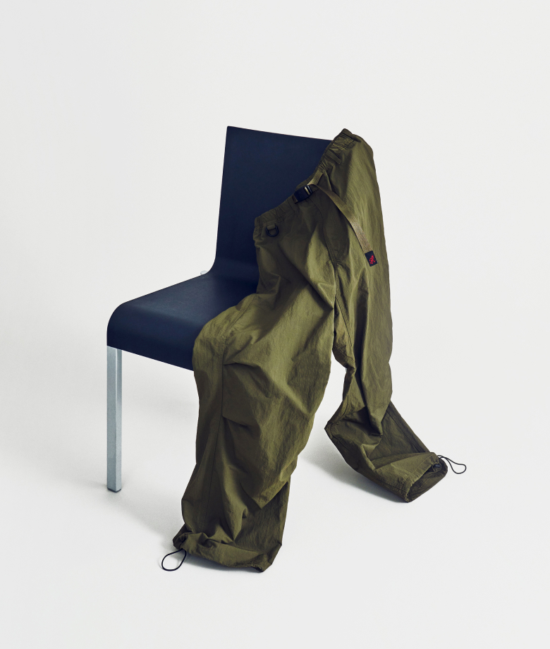 今シーズンもBEAMSでは太めのパンツを多く提案しているのですが、特にプッシュしているのは〈GRAMICCI〉と形から一緒に作ったこちら。足元に向かってボリュームがあるフォルムは、裾のドローコードを絞ってさらに強調させることも。昨年秋にデニム、そして今年はナイロンで展開しています。