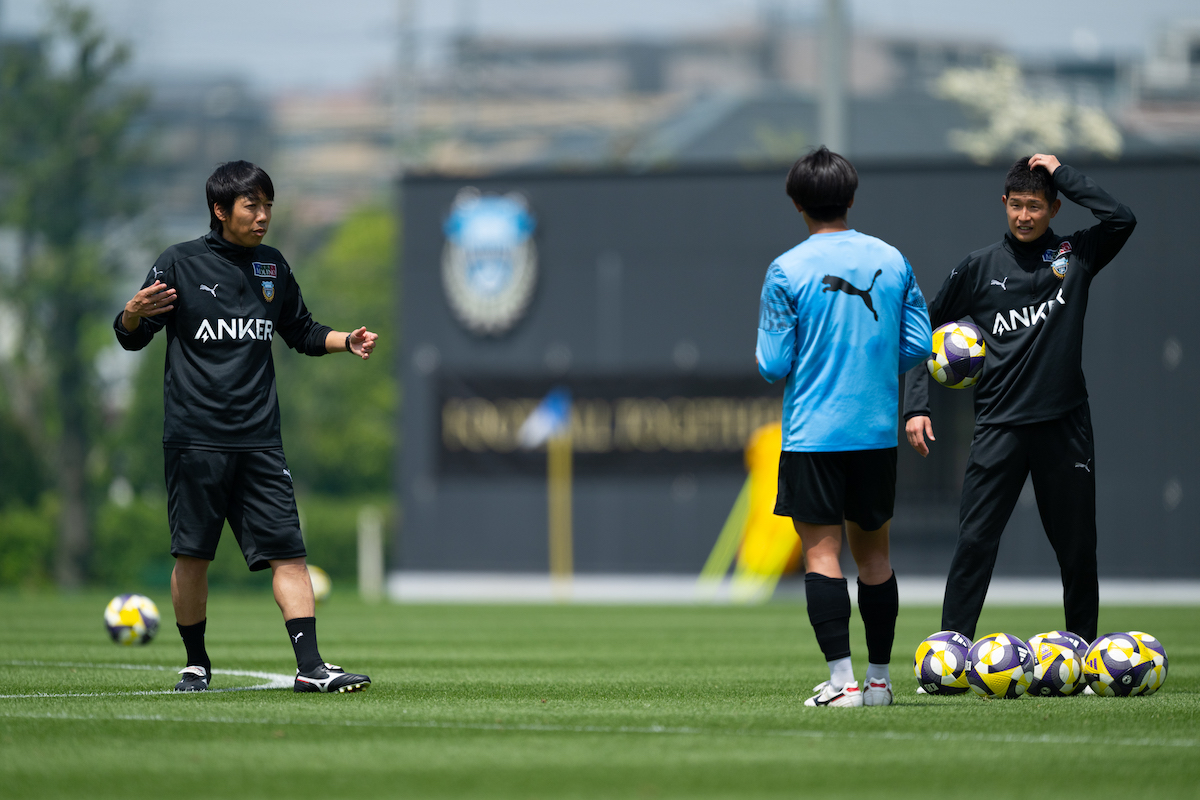 練習の合間、選手たちと言葉を交わす。©KAWASAKI FRONTALE