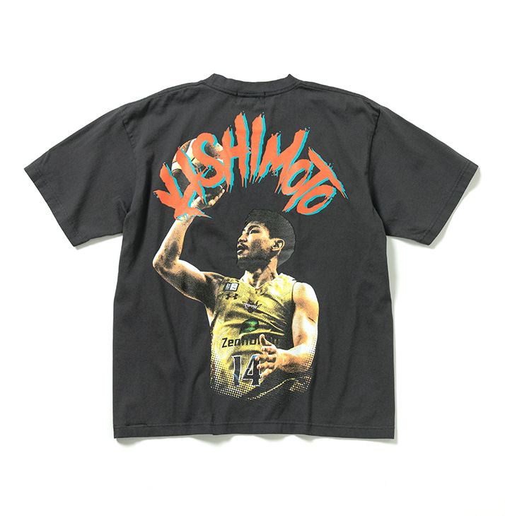岸本隆一選手をテーマにした半袖Tシャツ。背面に選手のグラフィックを大きくプリントし、印象的なデザインに仕上げています。ボディの染め方やプリント方法で特有のムラを表現しヴィンテージアイテムの雰囲気を演出。