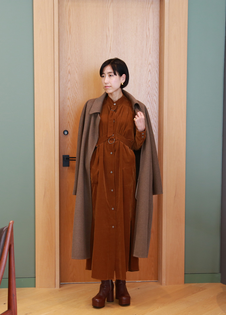 ナチュラルな配色の<seya.(セヤ)>のロングコートをセレクト。シルエットが特徴的な<PHOTOCOPIEU(フォトコピュー)>のコーデュロイワンピースに、トレンド感のあるプラットフォームブーツを合わせ、全体をブラウントーンでコーディネートしました。