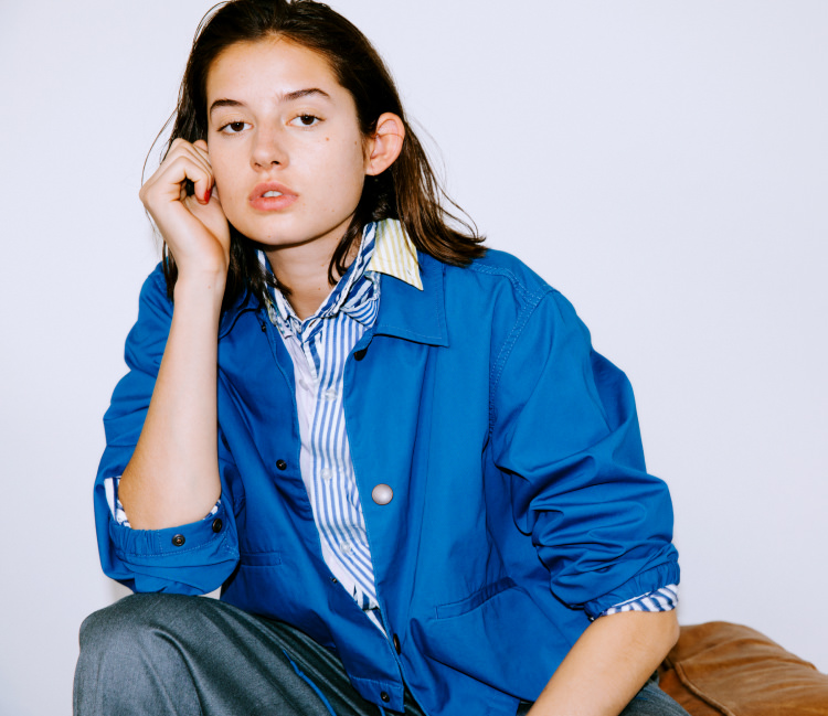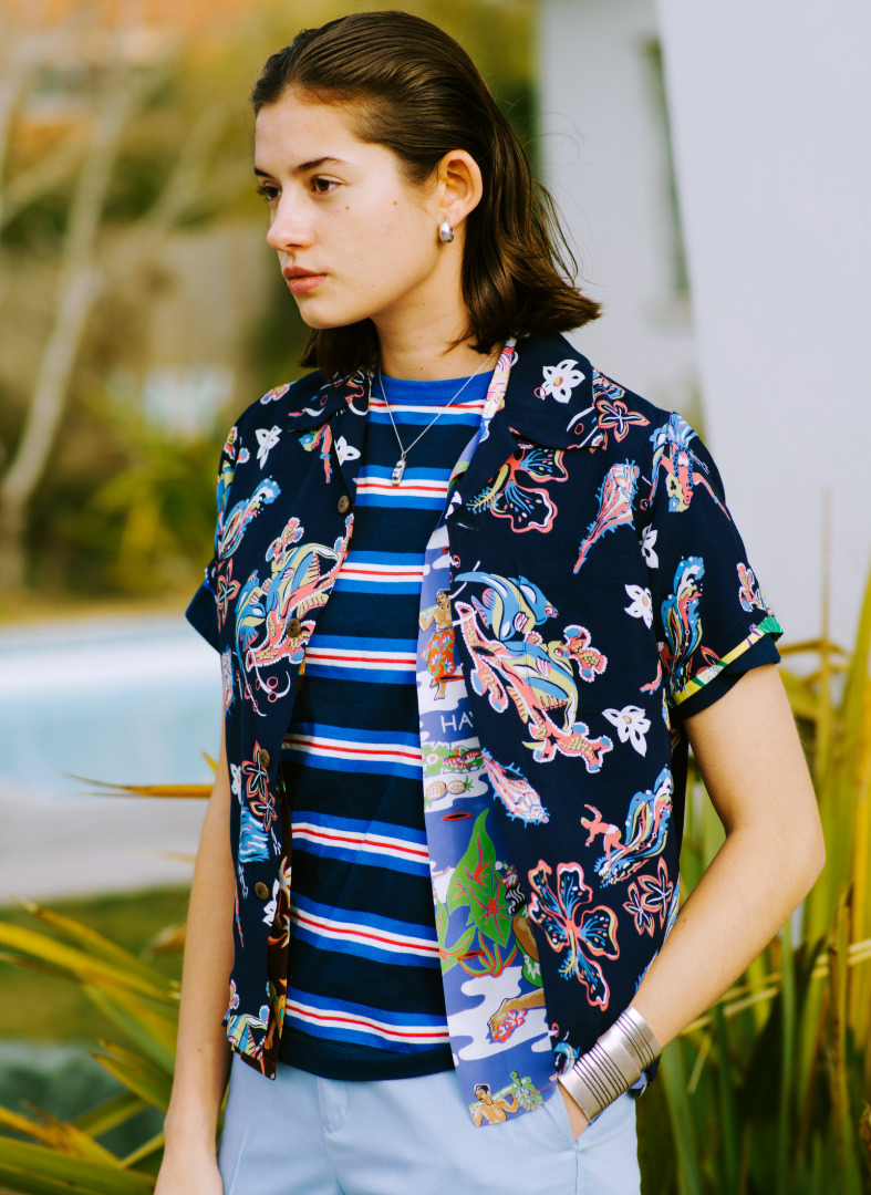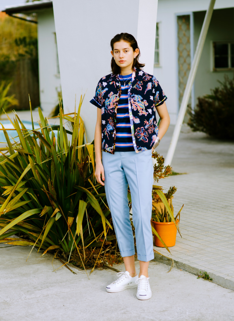 スムースな肌触りと優れた吸湿性。なにより、海や常夏の島のあれこれをモチーフにした楽しげな柄使い。ハワイアンシャツはやはり夏に着たいアイテムのひとつ。きわめてアイコニックなシャツゆえ、シンプルにコーディネートしてもいいけれど、あえて重ね着をしてみても。さらにインナーのTシャツもマルチカラーのストライプに。柄オン柄オン柄のクレイジーな着こなしで、遊び心がはじけつつも、まとまった印象なのは、ポイントはすっきりとしたシルエットのスラックスと、全身をブルー系のトーンで統一していること。さらに、足もとはクラシックな白のスニーカー『ジャックパーセル』で軽やかに。アッパーにパテントレザーを使用した別注モデルです。