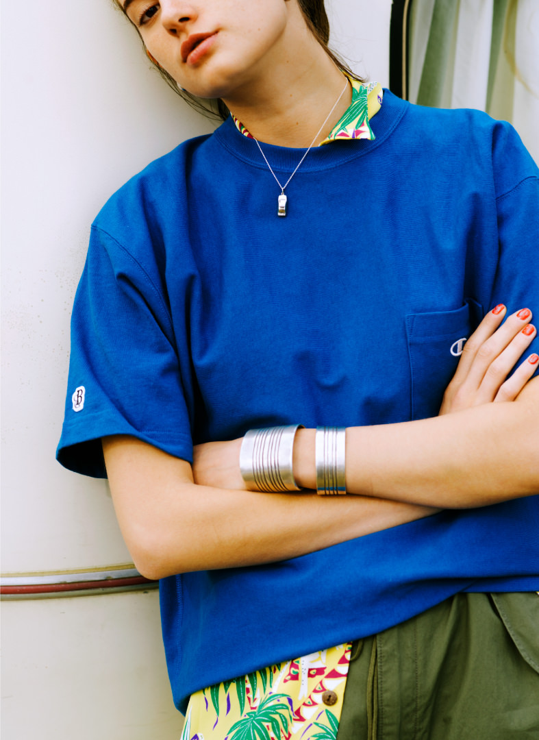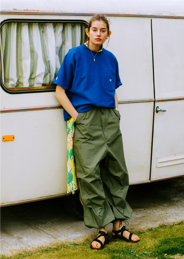 スウェットシャツの王様。といえばアメリカの<CHAMPION(チャンピオン)>のリバースウィーブ®というのが基本。なにかと丈夫で、コットン100パーセントなのに縮みにくく、洗濯するほどに着心地もよくなっていく。キングと呼ばれるだけのことはあるのですよ。そのTシャツが、別注モデルとしてラインナップ。肩が落ちるくらいのやや大きめなトレンドのサイジング。だけれどレングスは短めとなっていて、バランスがとりやすい仕上がり。ボトムスはこちらもミリタリーウェアの王道、M-51パンツの防風防寒用途で開発されたオーバーパンツをモデルにしたもの。ハリのあるコットン生地を使用していて、肌馴染みがいい。いずれも着続けるほどに味わい深くなる、アメカジらしいアイテム。シルエットやサイズバランスや着こなしで、今のムードもどこかにちゃんと。