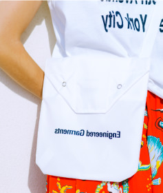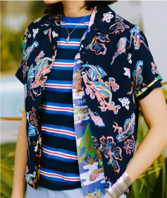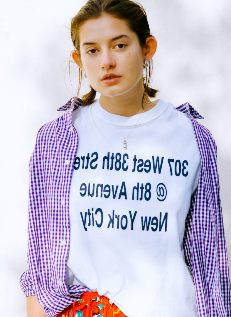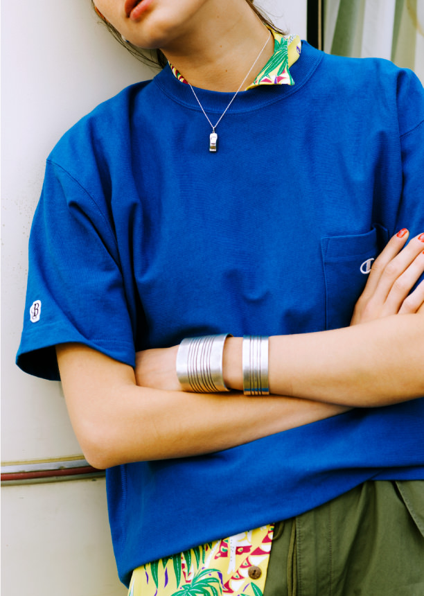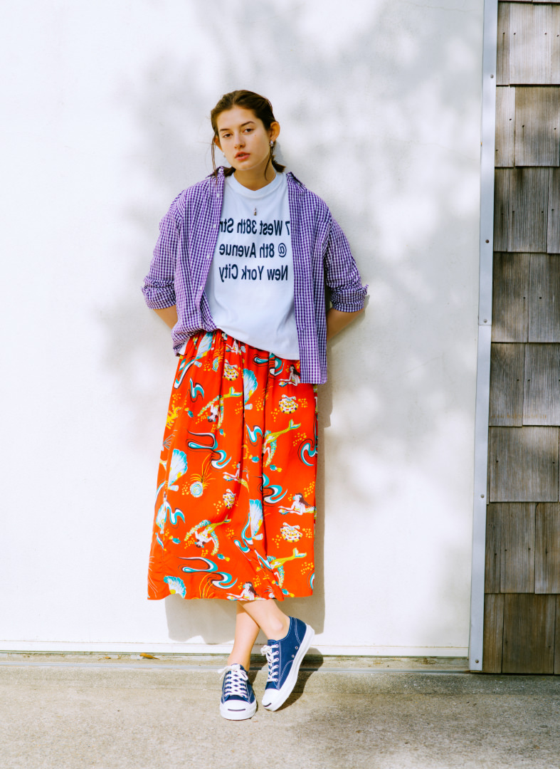 ハワイアンシャツの涼しげな肌触りをスカートに。<SUN SURF(サン サーフ)>とのコラボレーションで手掛けたハワイアンスカートがこの夏もラインナップ。柄に採用されているのは、ヴィンテージコレクターの中でも人気を集める、希少なマーメイド柄。こちらは1950年代にオアフ島で創業した老舗メーカー、キロハナ社の鮮やかで美しい色使いを、そのまま再現したもの。ようするにクラシックで本格派なのです。Tシャツは<ENGINEERED GARMENTS(エンジニアド ガーメンツ)>の別注モデル。ミラー反転したプリントロゴは、デザイナーの鈴木大器氏のN.Y.のお気に入りスポットのアドレスだとか。パープルのギンガムチェックのシャツをラフに羽織って、気取りのないサマースタイルに。