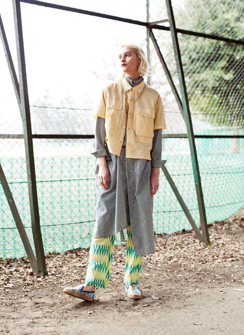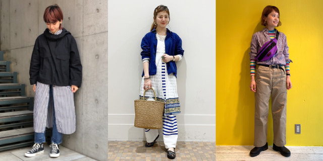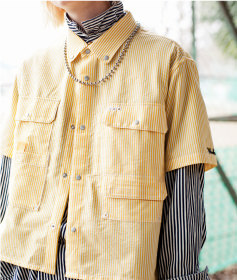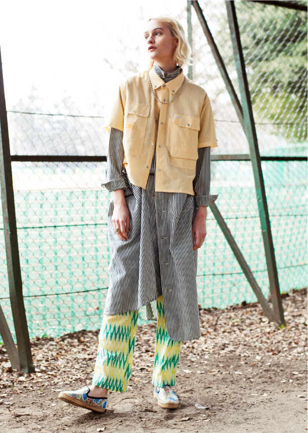 フロントに多機能な4つのポケットとスナップボタン。肩や身幅はゆったりとしていて、レングスはややショートというユニークなシルエット。これらの特徴的なディテールは、いずれもアメリカのフィッシングシャツそのもの。アウトドアの名門ブランド、<WOOLRICH(ウールリッチ)>へのスペシャルオーダーによって手がけられている。ファブリックは吸水性と速乾性、ストレッチ性を備えた機能素材を使用しており、夏のアクティブなシーンでも頼りになりそう。ヒッコリーストライプのワンピースは、カバーオールをモチーフにした<orslow(オアスロウ)>の別注アイテム。カラフルなパンツはメキシコの伝統的な織物から着想を得ている。フィッシングとワークとメキシコ。テイストの異なるアイテムをミックスすると、こんなに楽しい。
