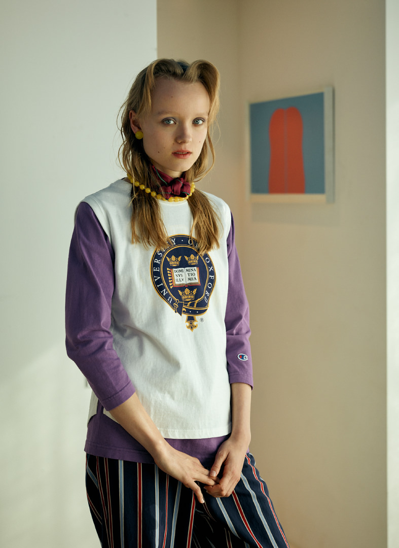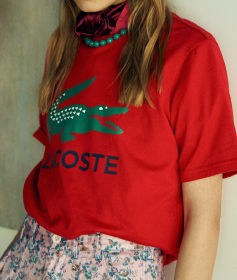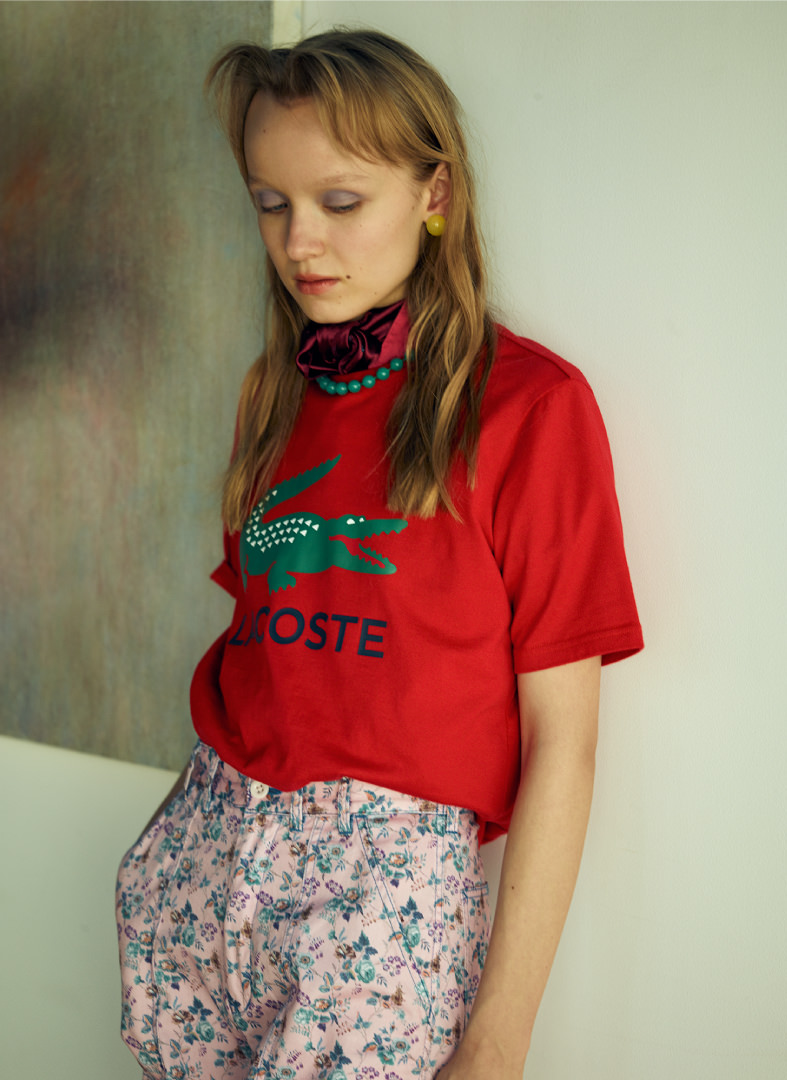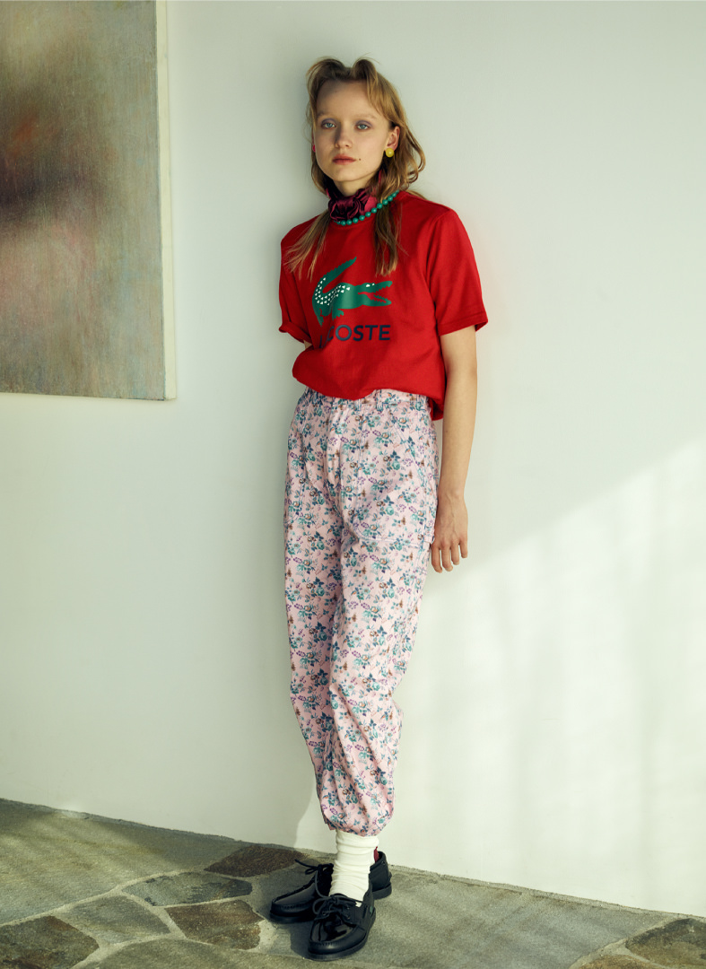 淡いピンクにフラワーパターン。いかにもガールズライクなボトムスだが、ディテールに目を転じれば、印象はがらりと変化。生地は打ち込みのしっかりしたコットンツイルで、フロントとバックには大ぶりのパッチポケット、サイドにはハンマーループとツールポケットも。つまりオーセンティックなペインターパンツなのです。絵柄は英国の老舗、リバティ社の“ヨークシャーローズ”。色鉛筆のような繊細なタッチで表現したプリントは、チャーミングでありながらどこかに品の良さもある、ココロニクイ仕上がり。トップスのTシャツは、ワニのロゴをあえてビッグにした<LACOSTE(ラコステ)>への別注品。どちらもパワフルなアイテムで、コーディネートを引き立てる。