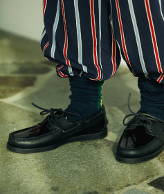 リラックスしたシルエットと、さらさらとした肌触り。イタリア産の上質な生地のパジャマパンツは、春のボトムスとしてうってつけのアイテム。素材にはビスコースとナイロンをミックスしており、着心地はソフトだが、シワになりにくいという機能性も。柄はシックなカラーリングのオルタネイトストライプで、生地感とあいまってレジメンタルタイのようなムード。そちらにカレッジロゴのノースリーブTシャツをコーディネートすることで、この春らしいプレッピーなスタイルが完成。足もとは<PARABOOT(パラブーツ)>に別注したデッキシューズで、印象はよりトラッドに。一方で首まわりにはスカーフとネックレスを重ねづけ。遊び心もお忘れなく。